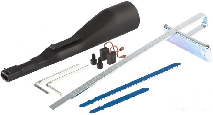- Полная комплектация — лобзик поставляется с направляющей, пилками по дереву и металлу, шестигранным ключом, адаптером для подключения пылесоса и запасными угольными щетками.