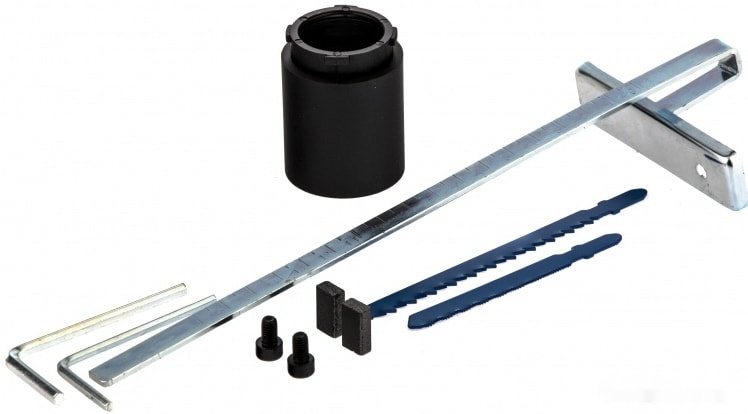 - Полная комплектация — лобзик поставляется с направляющей, пилками по дереву и металлу, шестигранным ключом, адаптером для подключения пылесоса и запасными угольными щетками.
