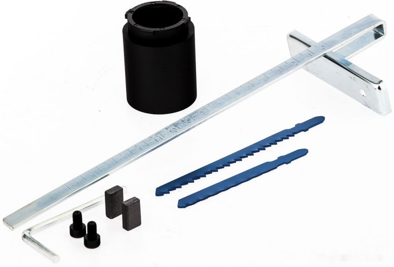 - Полная комплектация — лобзик поставляется с направляющей, пилками по дереву и металлу, шестигранным ключом, адаптером для подключения пылесоса и запасными угольными щетками.