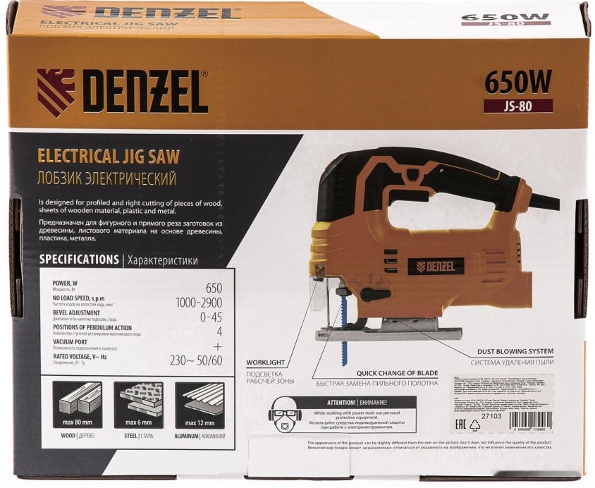 ХарактеристикиАртикул 27103Бренды DENZELСтрана производства КитайПитание сетьТип корпуса рукоятка-скобаМощность 650Глубина пропила (дерево) 80Глубина пропила (сталь) 6Глубина пропила (цветные металлы) 12Частота ходов 2900Режим маятникого хода естьРегулировка частоты хода естьПодсветка рабочей зоны естьАвтоматический сдув опилок естьПодключение к пылесосу естьСистема быстрой замены пилок естьЛазерный маркер нетКоличество пилок 2Кейс нетВес 2.8Комплектации ключЗащита от непреднамеренного включения ДаОписание набора Лобзик электрический ручной; - Пилка для дерева; - Пилка для металла; - Шестигранный ключ; - Направляющая; - Адаптер для подключения пылесоса; - Комплект запасных угольных щеток; - Инструкция по эксплуатации и гарантийный талон.Антивибрационная система НетЗащитный щиток ДаРегулировка оборотов ДаОписание товара обновлено 11.09.2025 10:38:33Штрихкод (EAN-13): 4044996172460