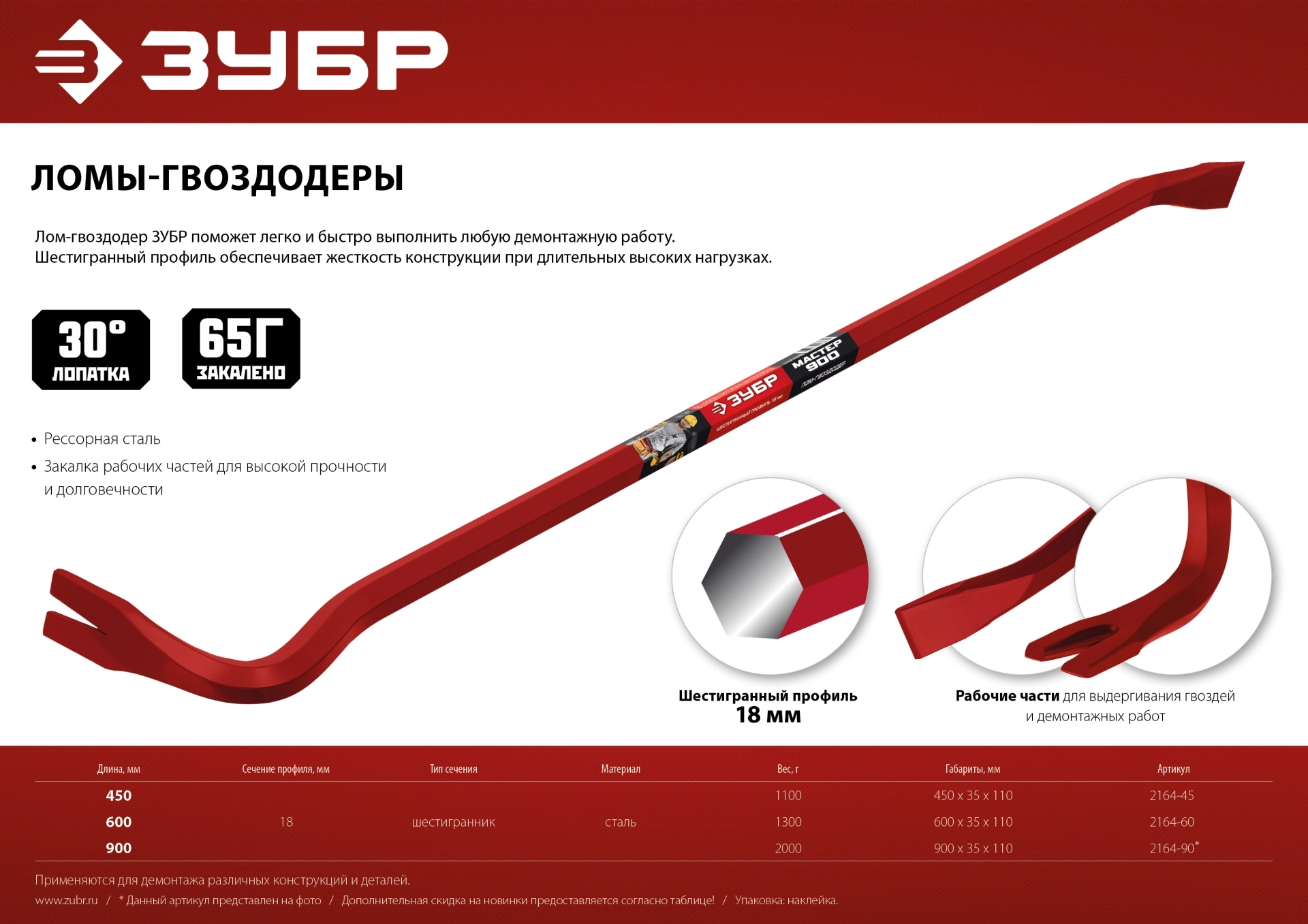 ПроизводителиЛом-гвоздодер 900мм/18мм, шестигранный (2164-90_z03) ЗУБР