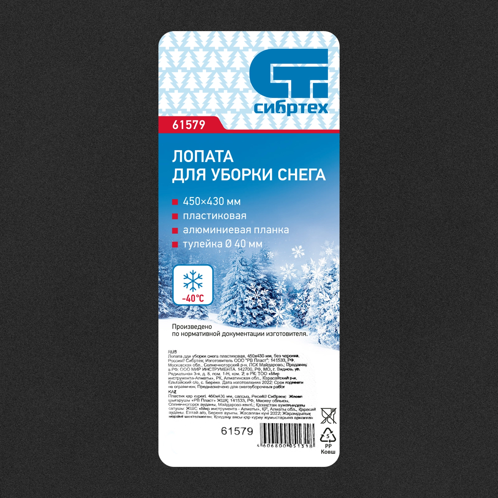 Бренд: СибртехПластиковая лопата Сибртех 61579, 450 х 430 мм, без черенка, используется для уборки снега на занесенных дорожках, тротуарах, подъездных путях. Эффективность работ обеспечивается благодаря вместительному ковшу с высокими бортиками. Ковш можно установить на черенок диаметром 40 мм, лопата совместима с артикулами 68425, 68422, 68441.