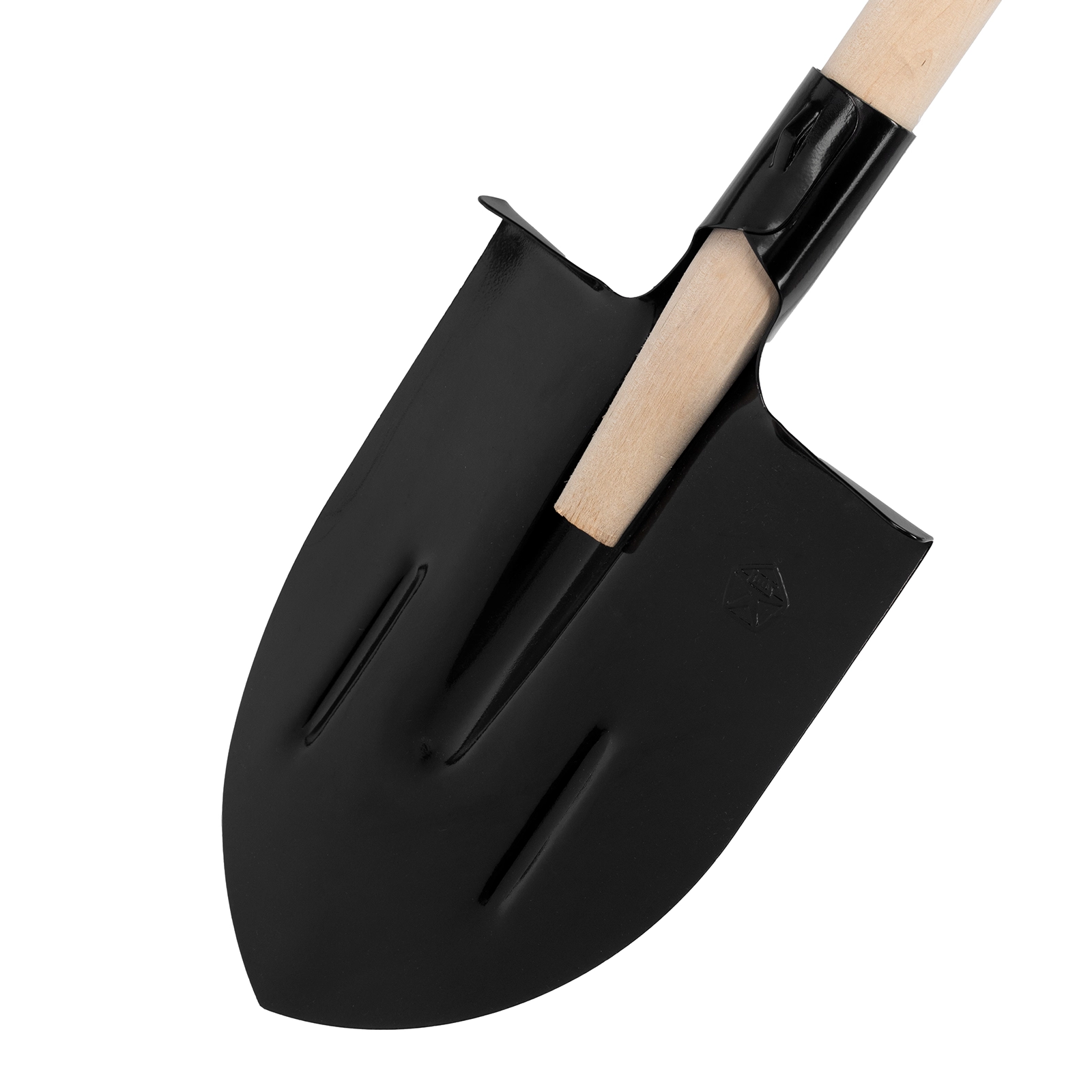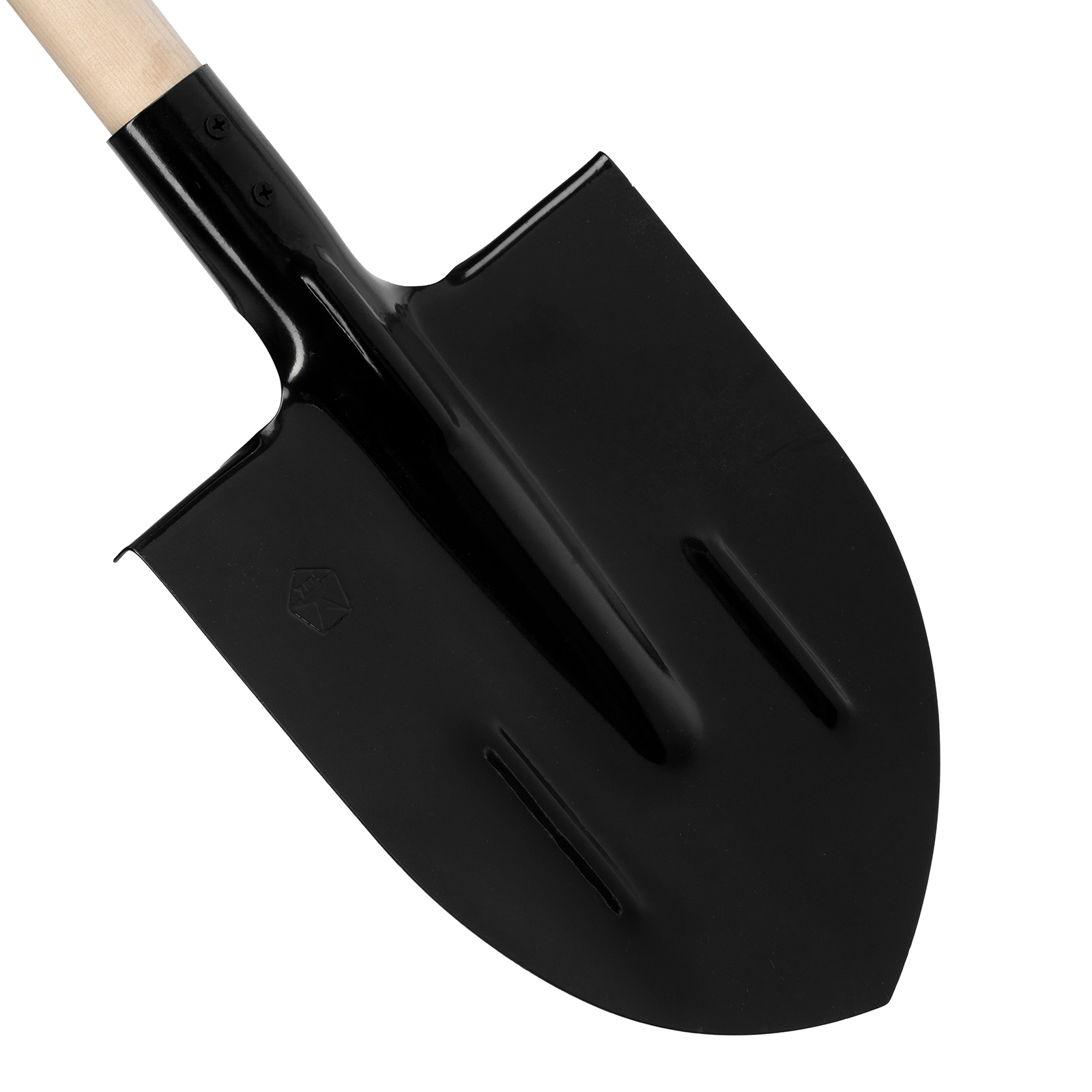 Верхняя кромка рабочего полотна имеет закругленную форму, что облегчает работу, т.к лопата легко проникает в грунт.