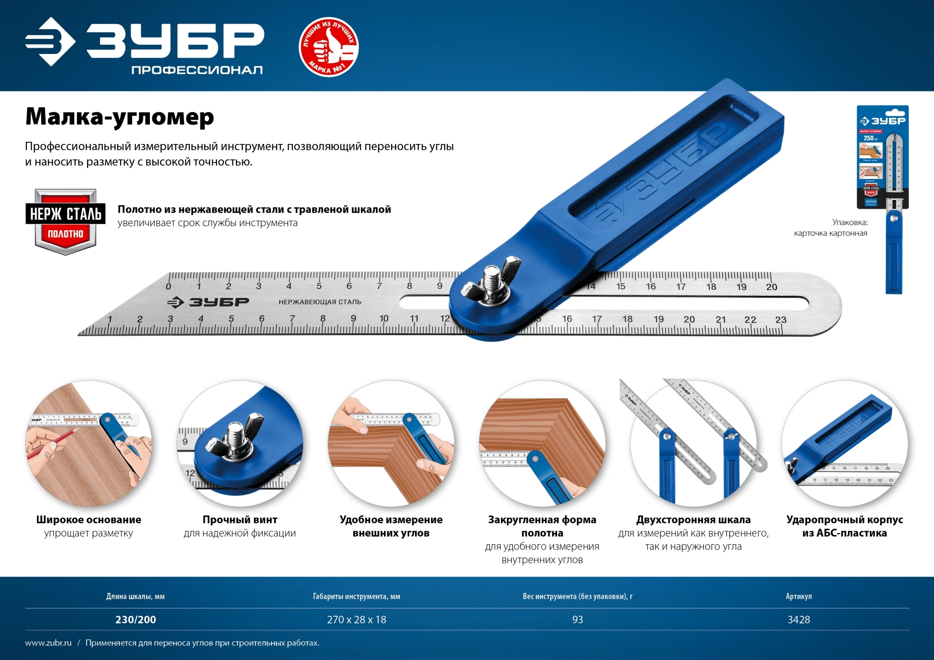 Малка-угломер ЗУБР МАЛКА 3428_z02, переноса углов при строительных работах.Производитель: Крафтул И/Е Гмбх, Альтер Поствег Штр., Лоенинген, Германия