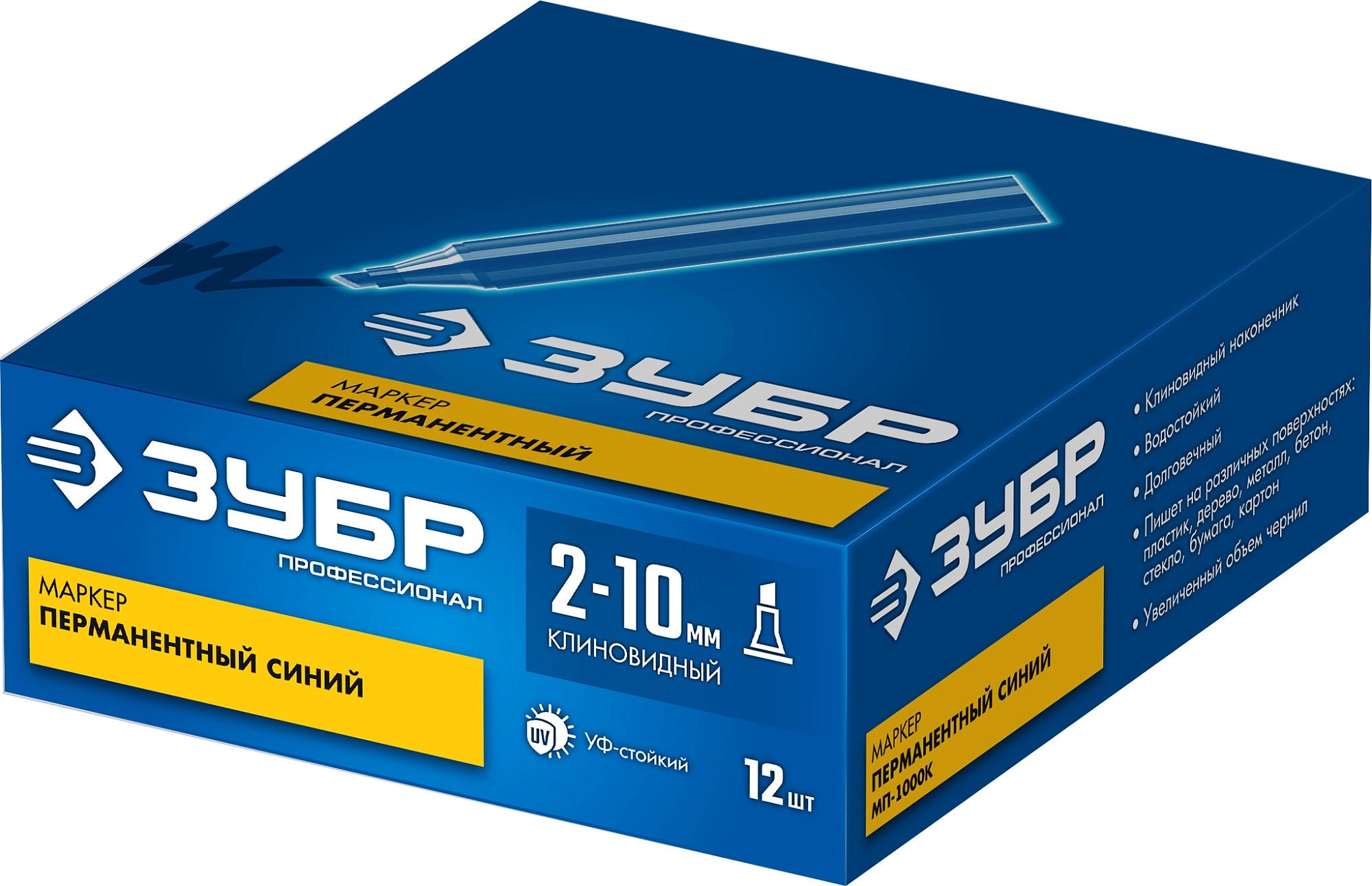ПроизводителиМаркер перм., синий, толщ. письма 2-10мм, клиновидный "МП-1000К" (06333-7) ЗУБР