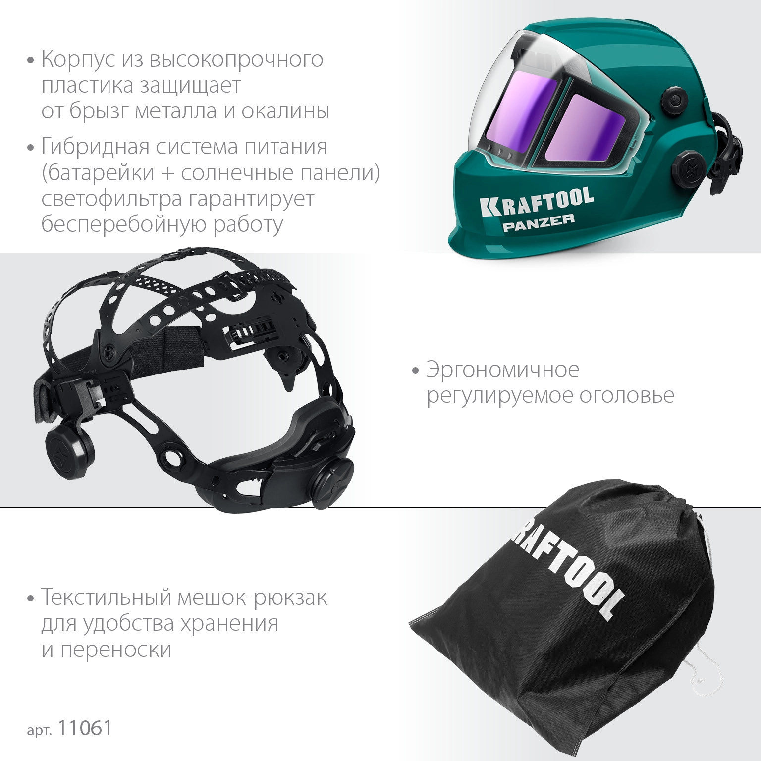 Бренд: KRAFTOOLПрофессиональная маска сварщика KRAFTOOL для защиты глаз и лица сварщика от прямых излучений сварочной дуги, искр и брызг расплавленного металла, от механических воздействий при выполнении сварочных работ, резки и пайки металла.