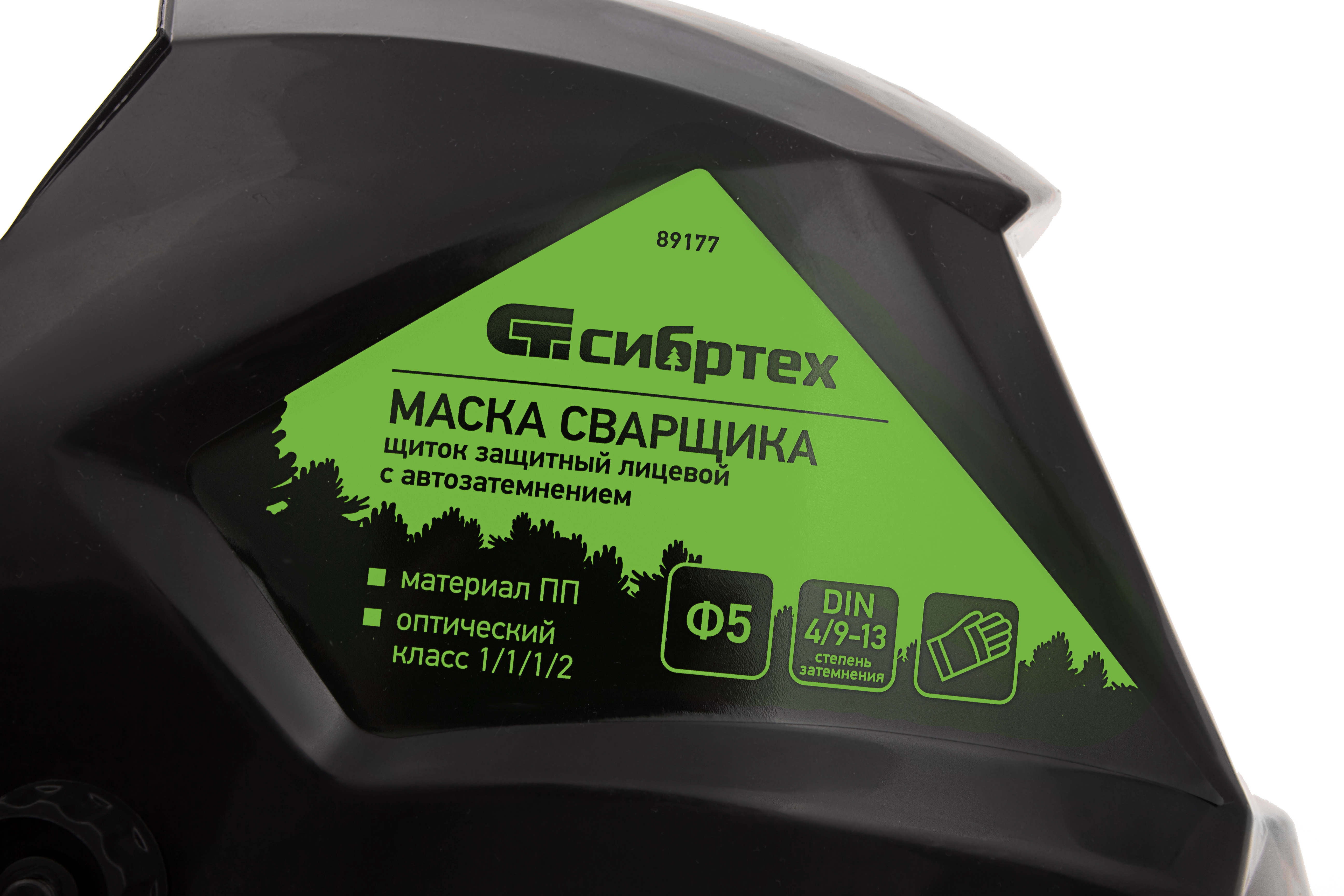 Защитный лицевой щиток, или маска сварщика, Сибртех Ф5 89177 с автозатемнением, упакованный в картонную коробку, закрывает глаза, лицо и шею мастера от света дуги, искр, ультрафиолета и горячих брызг. Предохраняет также от ожогов вследствие высоких температур во время сварочных работ.