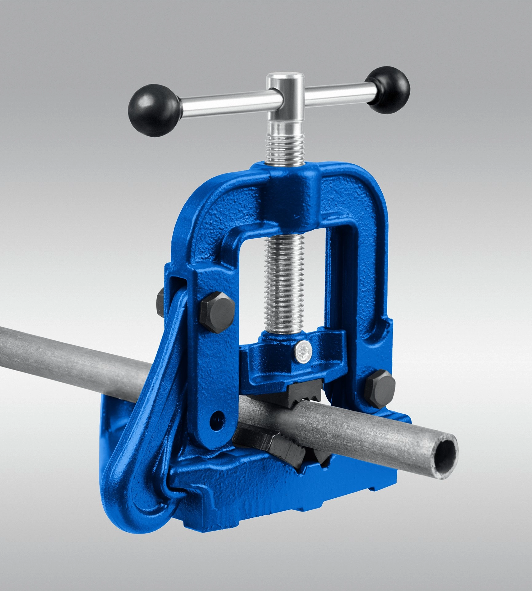 - Рельефная поверхность губок для надежного и безопасного крепления труб.