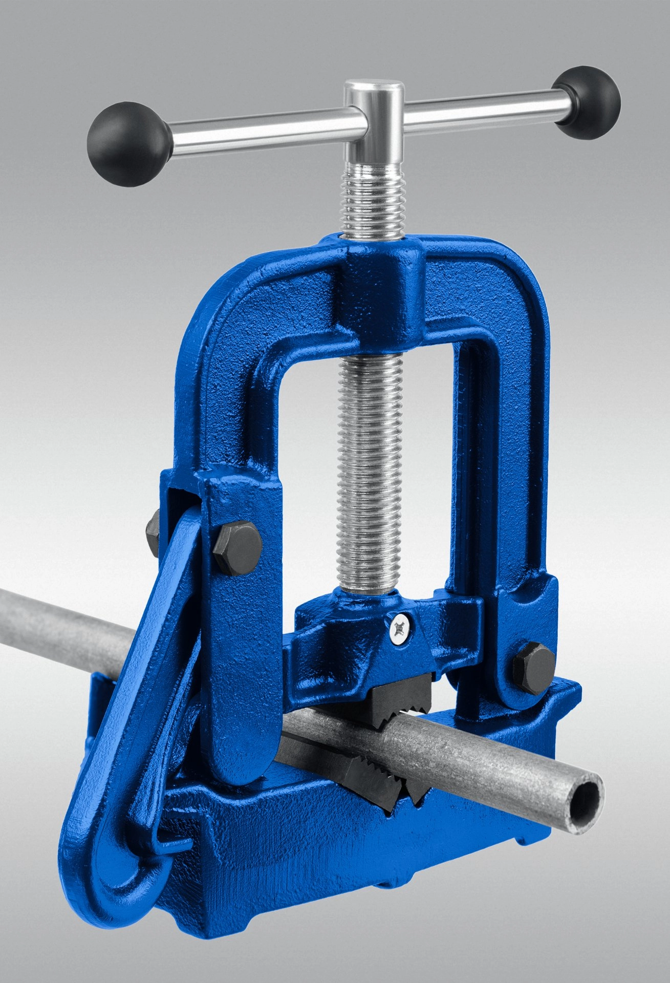 - Рельефная поверхность губок для надежного и безопасного крепления труб.