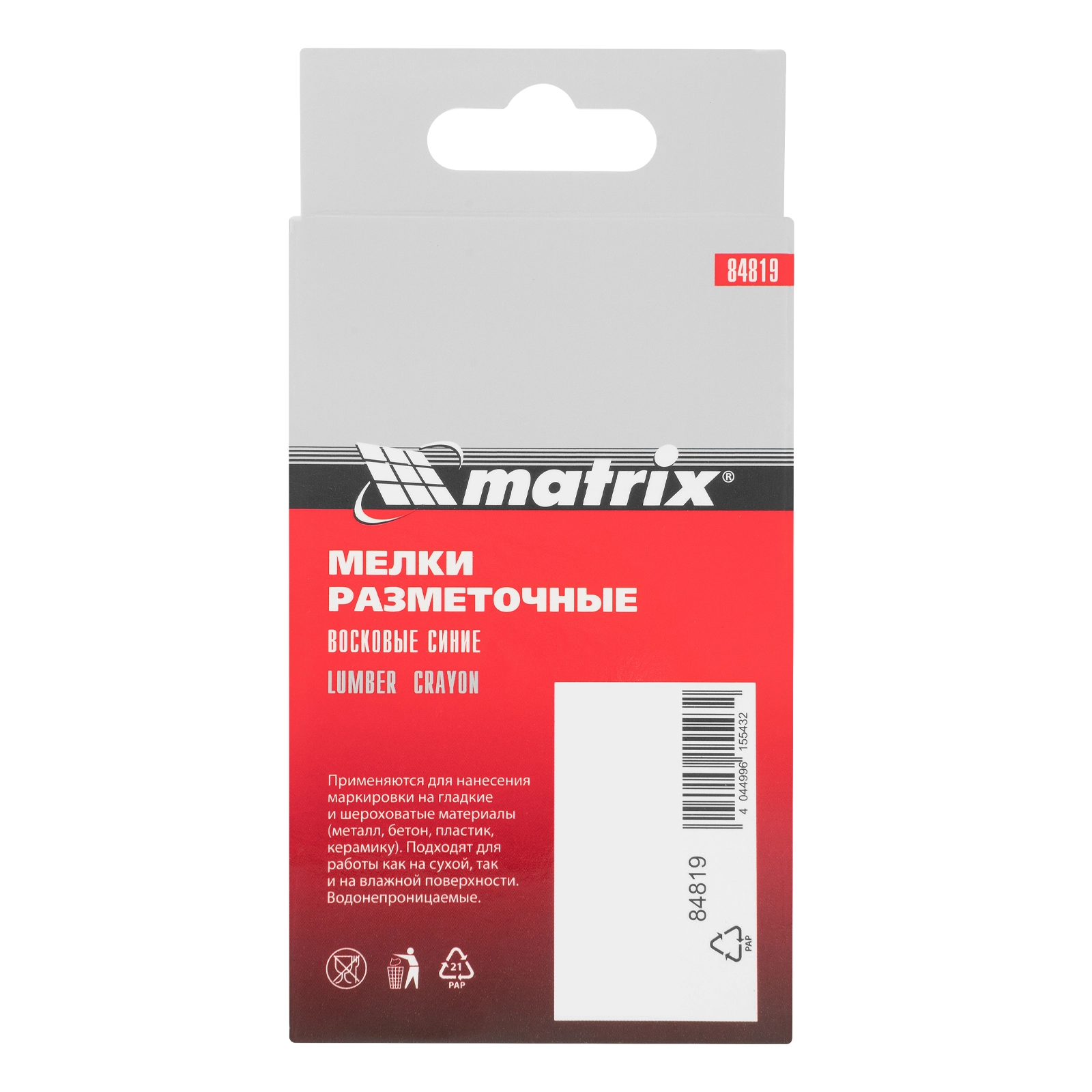 Синие разметочные восковые мелки Matrix 84819 длиной 120 мм, 6 шт. в коробке, пригодятся для нанесения линий и различных обозначений. Они универсальны, поэтому возможно применение на поверхностях с гладкой и шероховатой текстурой: бетоне, металле, пластике, керамике, стекле.Производитель: ООО "Мир инструмента", Россия