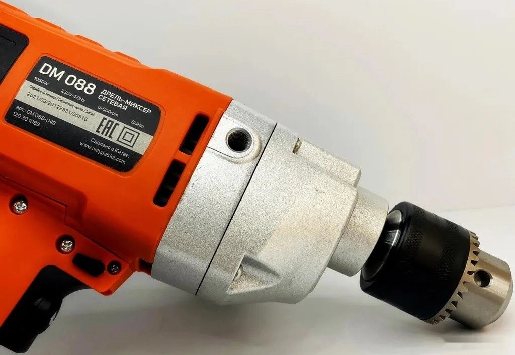 ПРОФИУровень качества. При классификации продуктов, имеющих схожее наименование, но обладающие различными потребительскими свойствами мы приняли следующий Вес факторов: 80% - подтвержденный ресурс, 15% - заявленная производительность/скорость, 5% - субъективные ощущения потребителя. ПодробнееХарактеристикиАртикул 120301088Бренды PATRIOTСтрана производства КитайГарантия 12 месяцевГабариты (ШхВхГ),мм 280х350х100Тип дрель-миксерПотребляемая мощность 1050Количество скоростей 1Уровень звукового давления, дБ(A) 95Макс. крутящий момент 80Число оборотов холостого хода 500Макс. диаметр сверления, дерево 80Макс. диаметр сверления, металл 16Диаметр патрона 16Скорость вращения 500Цвет оранжевыйМатериал корпуса металл/пластикРукоятка прорезиненнаяРеверс естьДвигатель/Тактность щеточныйДлина сетевого шнура 1.9Регулировка скорости нетЛегкий пуск нетЗащита от перегрева нетКейс в комплекте нетБлокировка кнопки включения нетМеталлический корпус редуктора естьПредохранительная муфта нетРежимы работы сверлениеПоддержание постоянных оборотов под нагрузкой нетТормоз двигателя нетПосадка патрона, дюйм М14Вес 4.1Питание сетьПатрон кулачковый (стандартный)Режимы скорости вращения 1Реверс естьДополнительная рукоятка естьКейс нетПылесборник нетПодсветка нетБесщеточный двигатель НетШирина в упаковке 36Высота в упаковке 28Глубина в упаковке 10Сверла нетБиты (насадки-отвертки) нетМешалка (венчик) нетКлюч для патрона естьФиксация кнопки включения ДаРегулировка оборотов ДаОписание товара обновлено 08.12.2025 14:06:40Электрическая Дрель миксер DM 088 с D-образной рукояткой оснащена реверсом и регулировкой скоростью с ограничителем для выбора оптимального режима работы к вязкости и плотности определенного раствора. Длительный срок службы обеспечивает большой, металлический корпус редуктора способствующий быстрому рассеиванию тепла. Электродвигатель DM 088 с напряжением 1050Вт развивает скорость 500 об / мин и имеет крутящий момент 80НМ для максимальной производительности при сверлении отверстий или перемешивании вязкого раствора.Производитель: 11th Flooor,LiYuanShangdu Building A2,201# LanTian Road,NingBo China