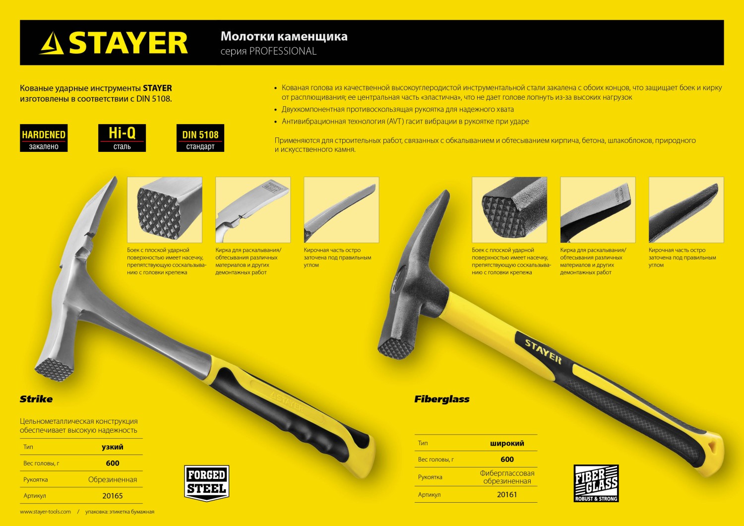 ПроизводителиМолоток каменщика 600гр, цельнометалл., двухкомп. ручка STRIKE "Professional" (20165) STAYER