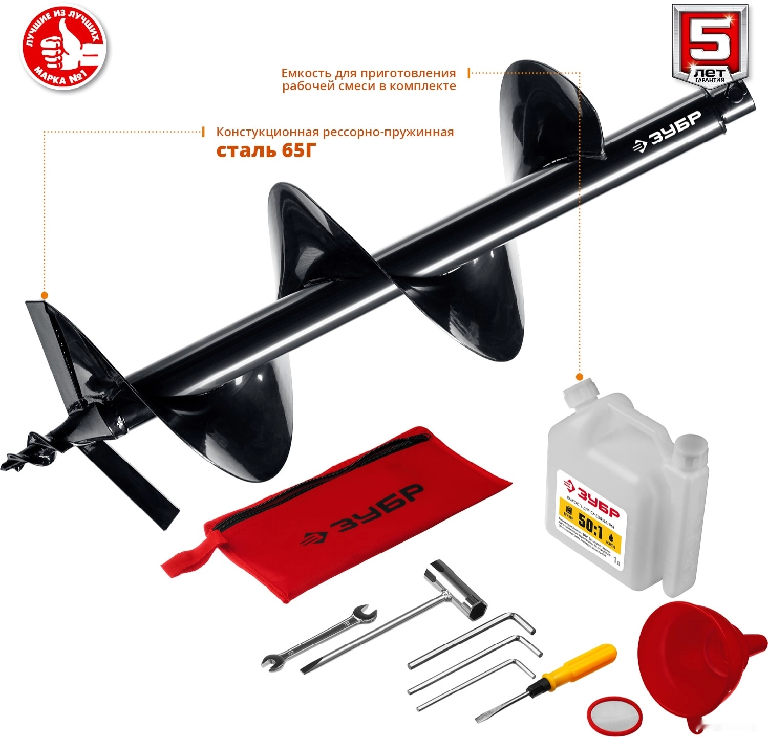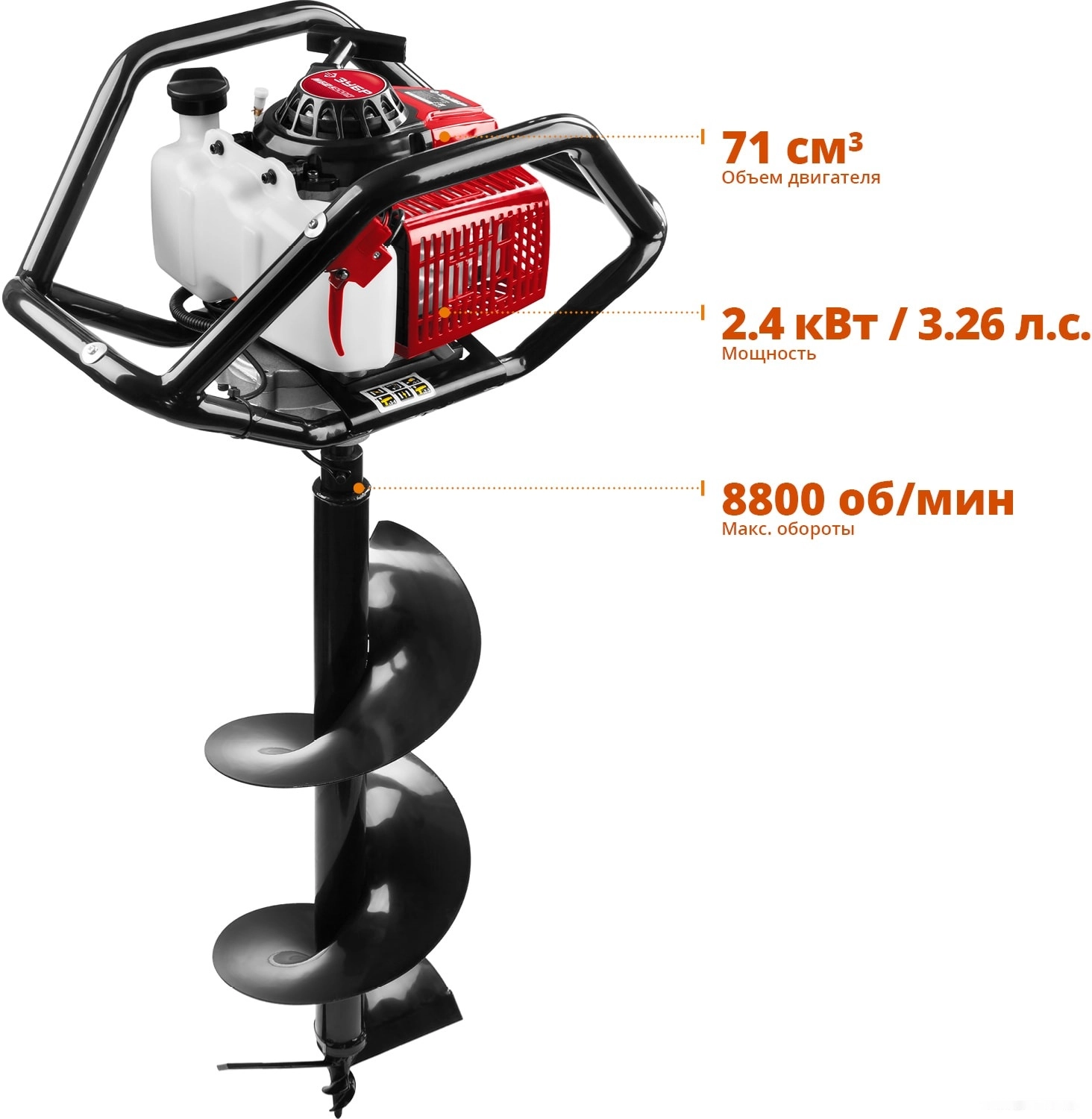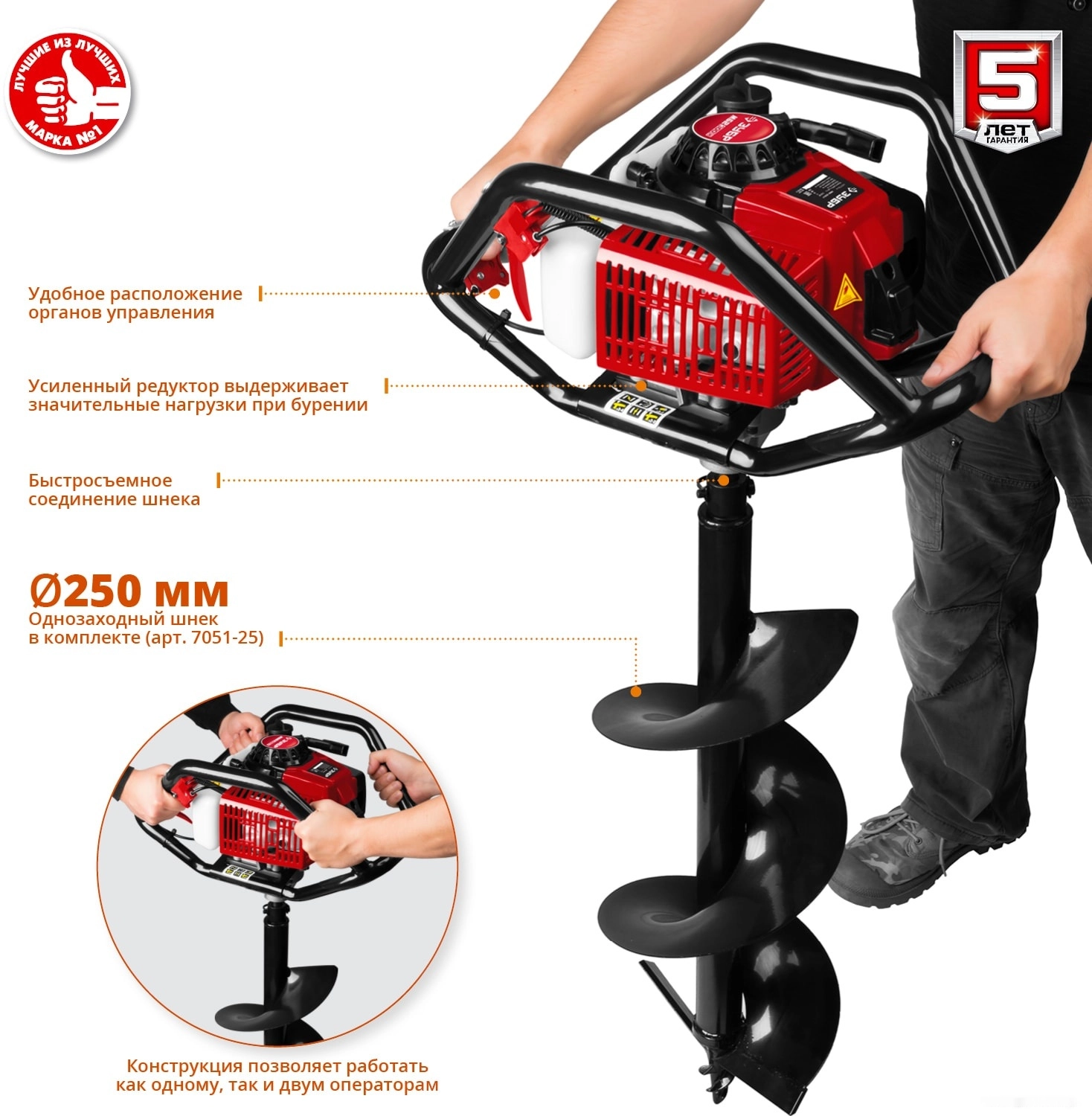 Мотобур (бензобур) ЗУБР МБ2-300 Н, предназначен для бурения мягких, твердых и мерзлых грунтов, а так же бурения льда при монтаже столбов, заборов, ограждений и других целей связанных с бурением грунта. Топливный насос для облегчения запуска. Воздушное охлаждение двигателя. Надежная рамная конструкция. Быстросъемное соединение шнека. Полупрозрачный топливный бак для контроля за расходом топлива. Система гашения вибрации. Емкость для приготовления рабочей смеси в комплекте. Инструмент управляется двумя операторами. Мощный 2-х тактный двигатель и универсальная конструкция рамы позволяют быстро и эффективно произвести необходимые работы по бурению. Конструкция рамы мотобура позволяет работать как одному, так и двум операторам, что повышает эффективность бурения, кроме того обеспечивает дополнительную сохранность двигателя при работе и транспортировке. Шнек в комплекте.