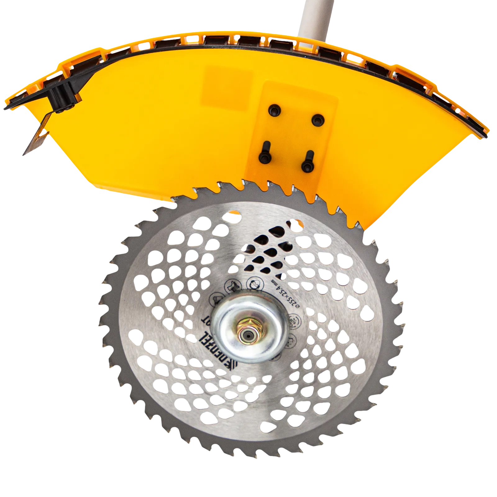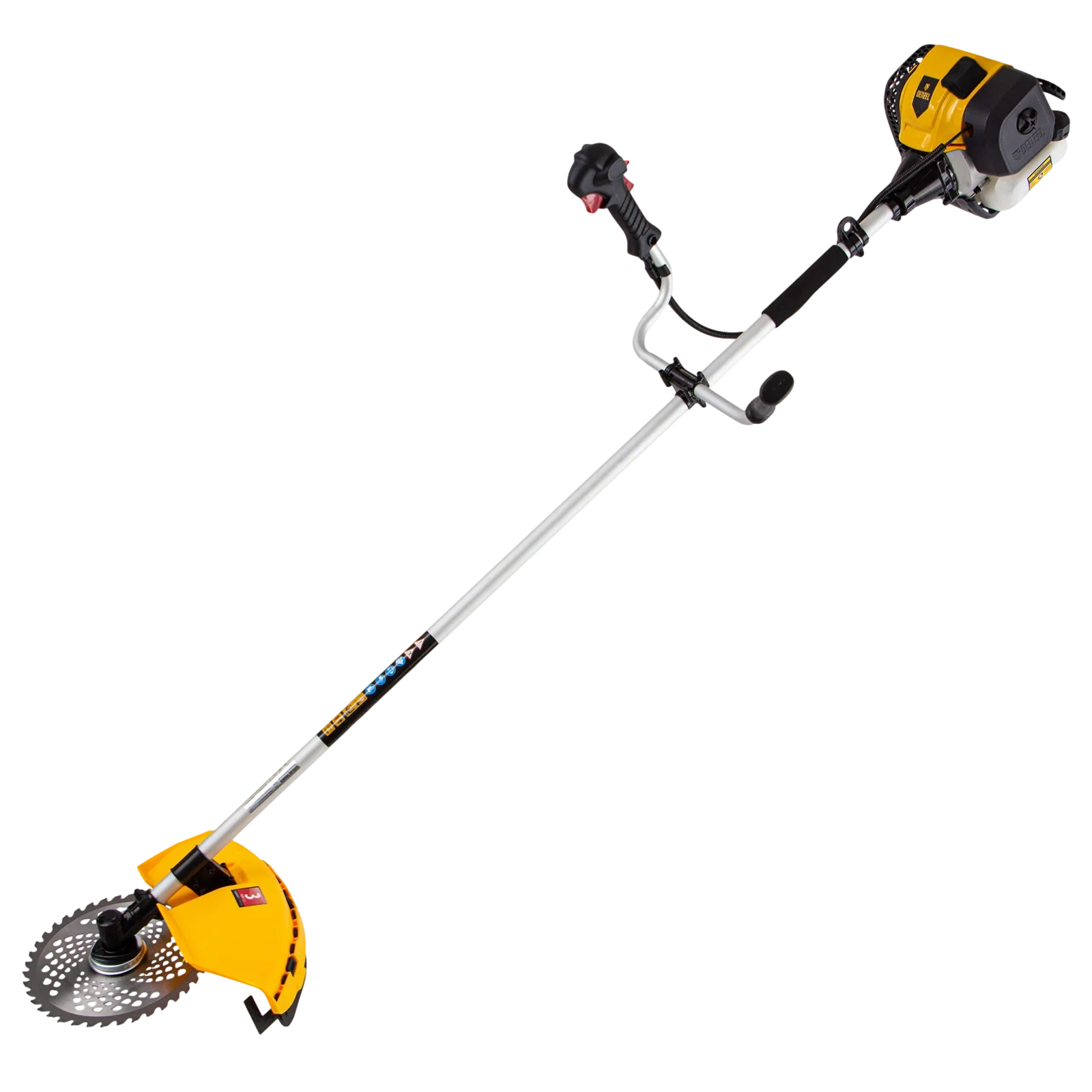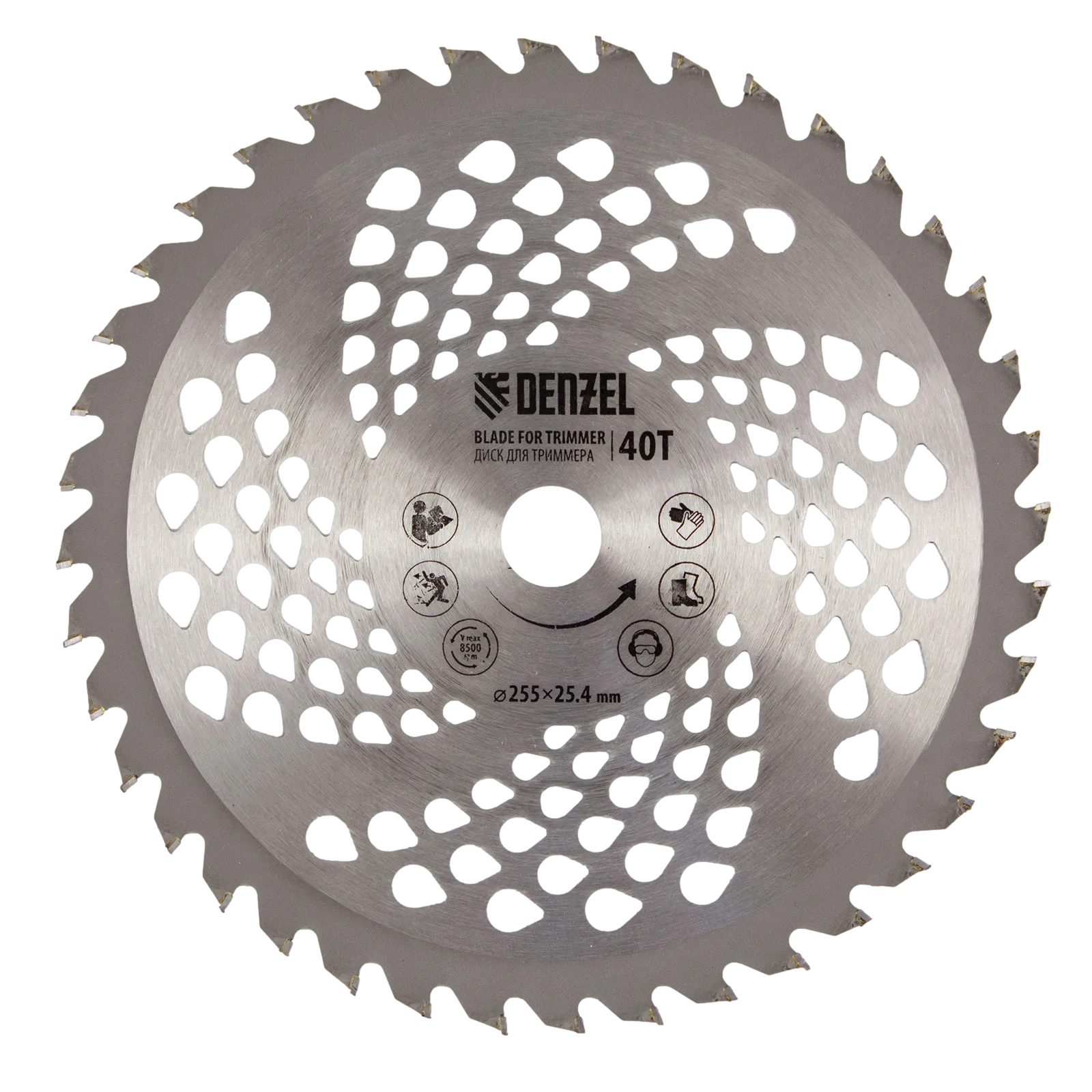- Дополнительные возможности — можно приобрести и установить на триммер диск Denzel 96323 для быстрого удаления растительности с жесткими стеблями, 96328 для скашивания молодых побегов кустарника диаметром до 3 мм.