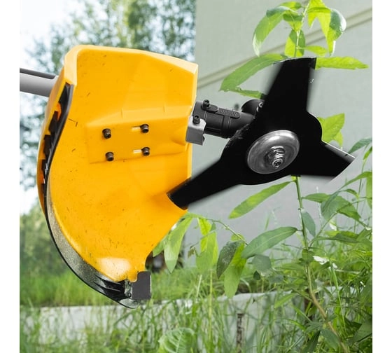 В комплект поставки входит 2 насадки: трехлопастной нож и леска, ширина скашивания составляет 25,5 см и 42 см.