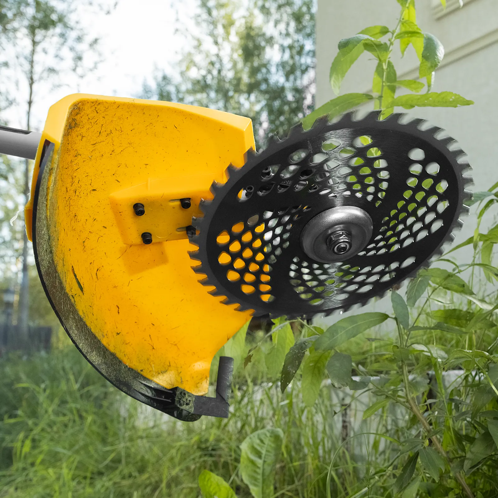 - Дополнительные возможности — можно приобрести диски Denzel 96323, 96325 для быстрого удаления растительности с жесткими стеблями (полыни, крапивы, лебеды) или 96328 для скашивания молодых побегов кустарника диаметром до 3 мм.