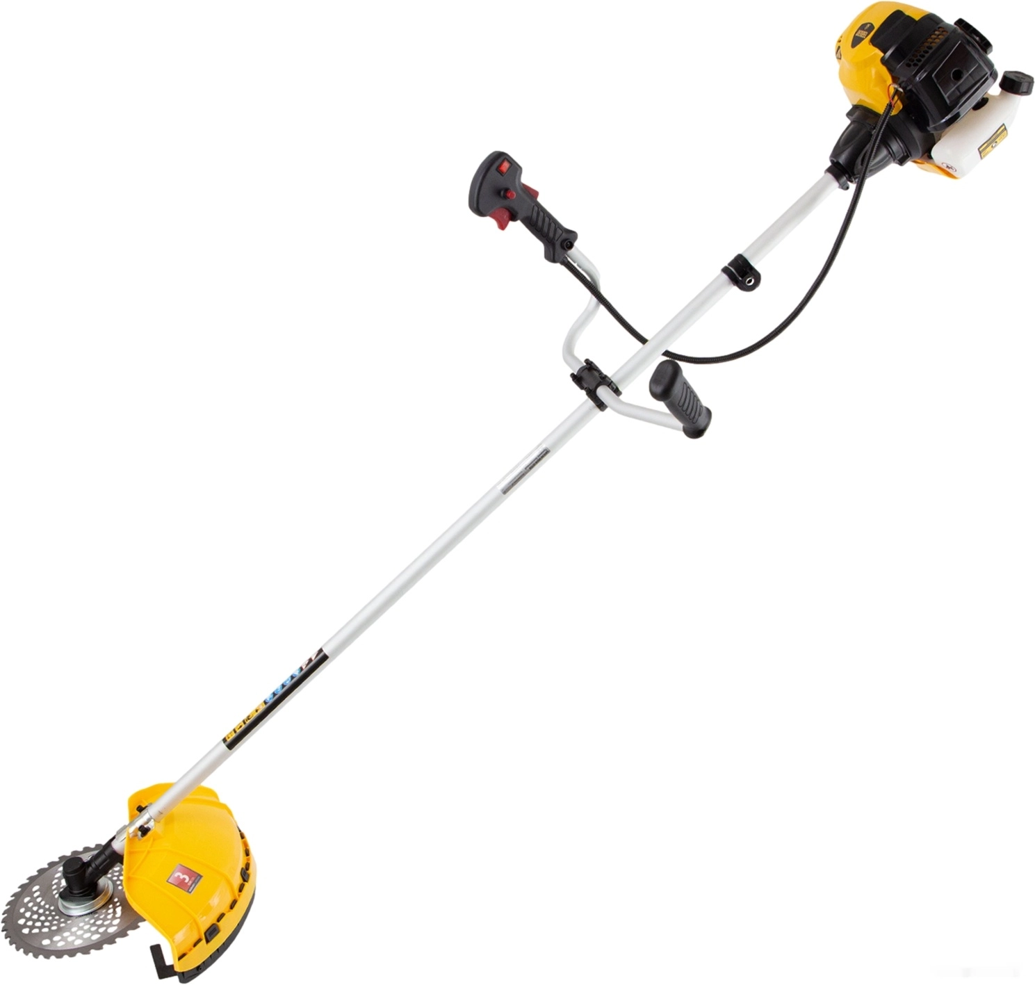 Он оснащен режущей леской и пильным диском из конструкционной стали, поэтому справляется с любой травой и молодым кустарником.