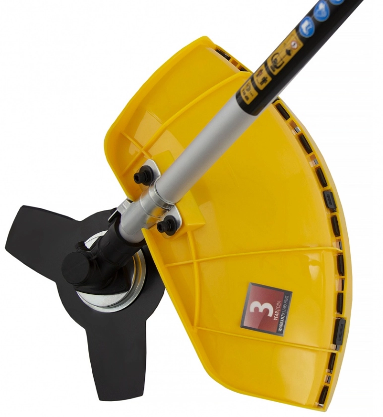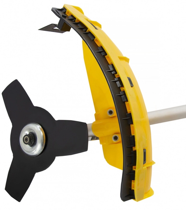 Он комплектуется сразу тремя режущими инструментами: леской с шириной скашивания 42 см, трехлопастным ножом и пильным диском с шириной скашивания 25,5 см.
