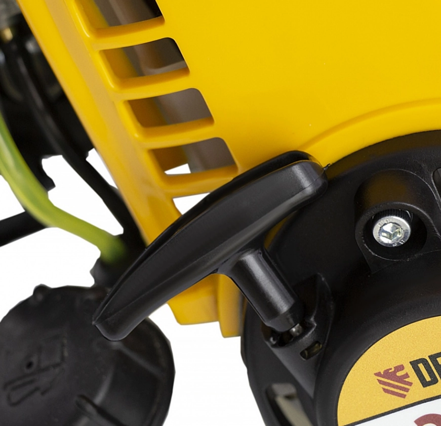 :Корпус из ударопрочного пластика защищает двигатель триммера от повреждений, а оператора — от травмирования и ожогов.