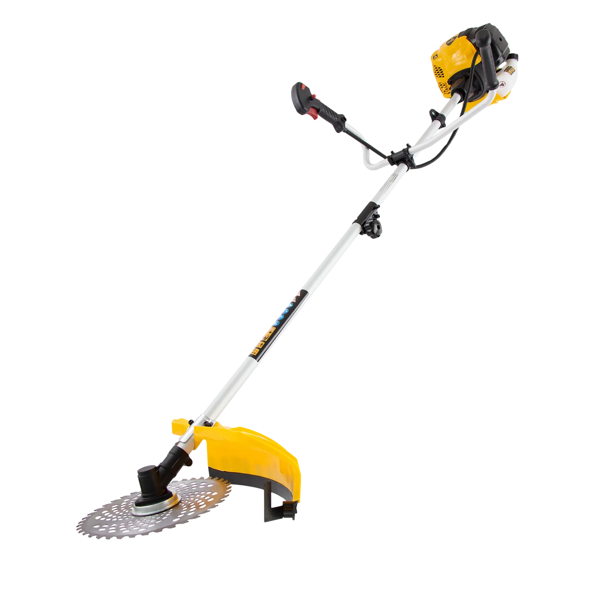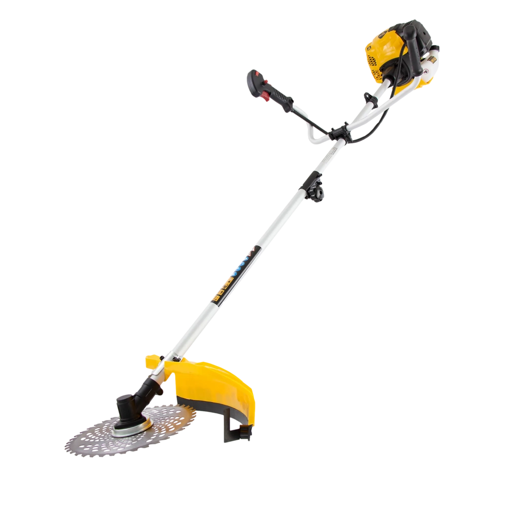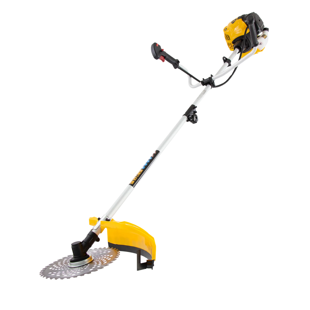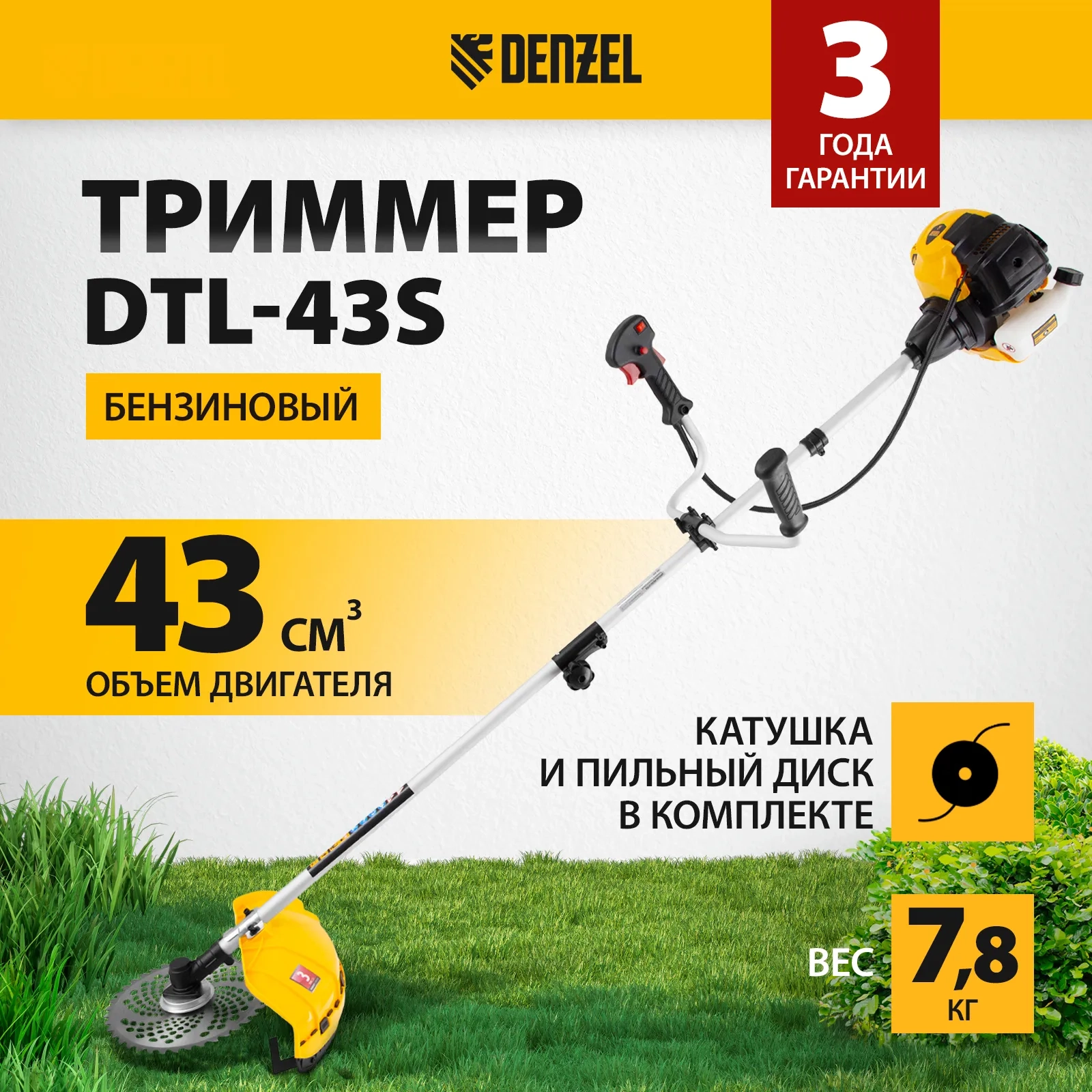 Бензиновый триммер Denzel DTL-43S 96264 с разъемной штангой, состоящей из 2 частей, оснащен 2-тактным двигателем объемом 43 см3 и предназначен для стрижки газона, скашивания травы всех типов, в том числе с жесткими древовидными стеблями (полыни, крапивы, лебеды, борщевика), а также срезания кустарника и молодых побегов деревьев с диаметром стволов до 10 мм. Усиленная катушка с леской и пильный диск, вращающиеся со скоростью 9500 об/мин, обеспечивают ширину скашивания 42 и 25,5 см. Инструмент не требует подключения к электросети, поэтому подходит для работы с влажной травой и может использоваться на отдаленных от дома участках.