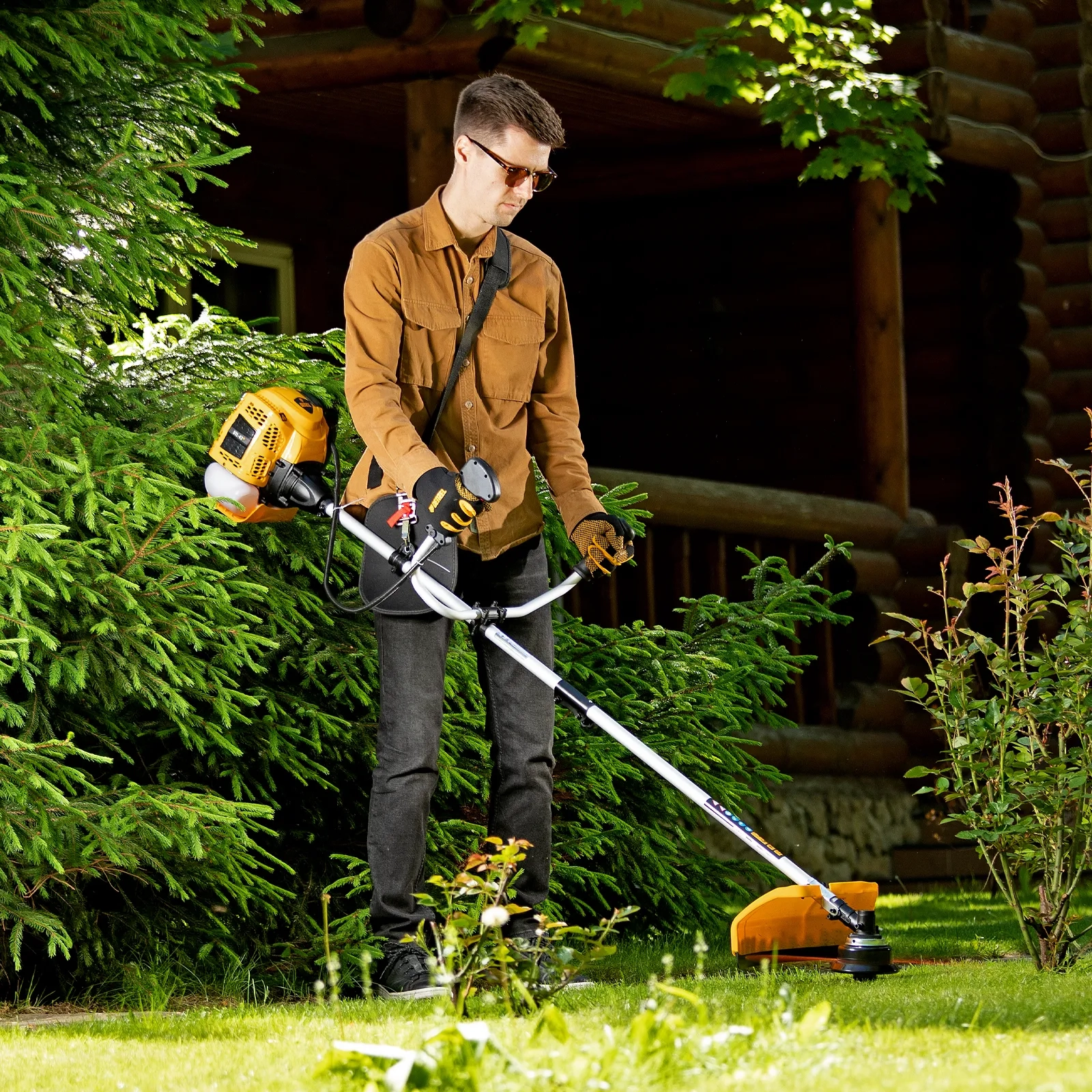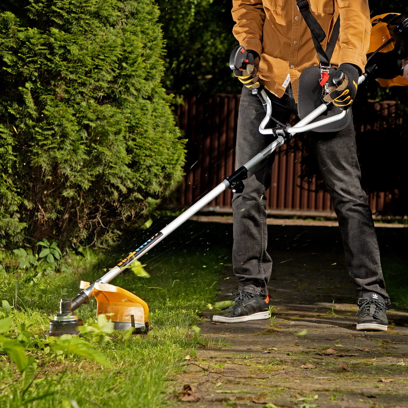 - Мобильность — небольшой вес 7,8 кг и качественная балансировка позволяют легко перемещать триммер и маневрировать даже на сложных участках.