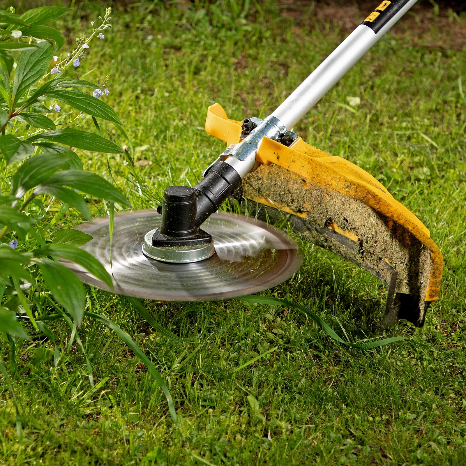 - Дополнительные возможности — можно приобрести и установить на триммер диски Denzel 96323, 96325 для быстрого удаления растительности с жесткими стеблями (полыни, крапивы, лебеды), 96328 для скашивания молодых побегов кустарника диаметром до 3 мм.