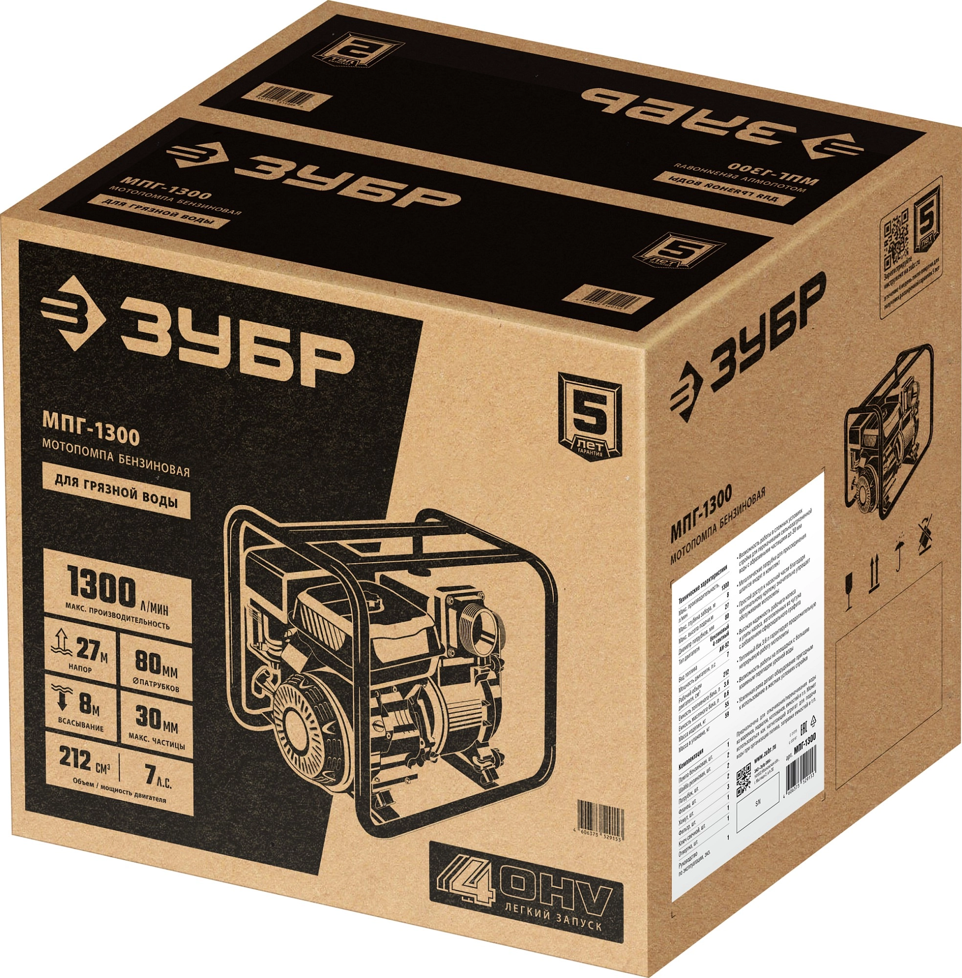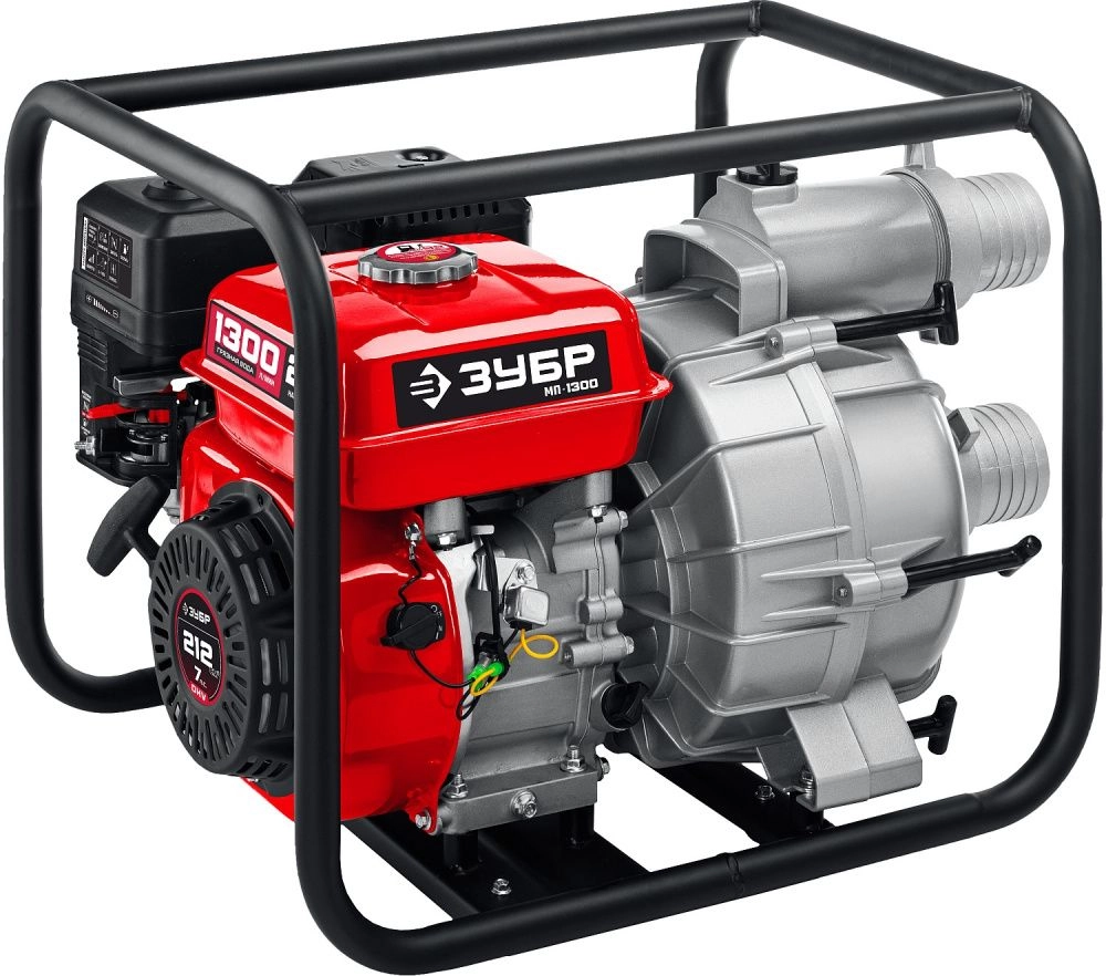 ПроизводителиМотопомпа бензиновая, для грязной воды МПГ-1300 (5.15 кВт, 1300 л/мин, патрубки 80 мм, кор.) ЗУБР