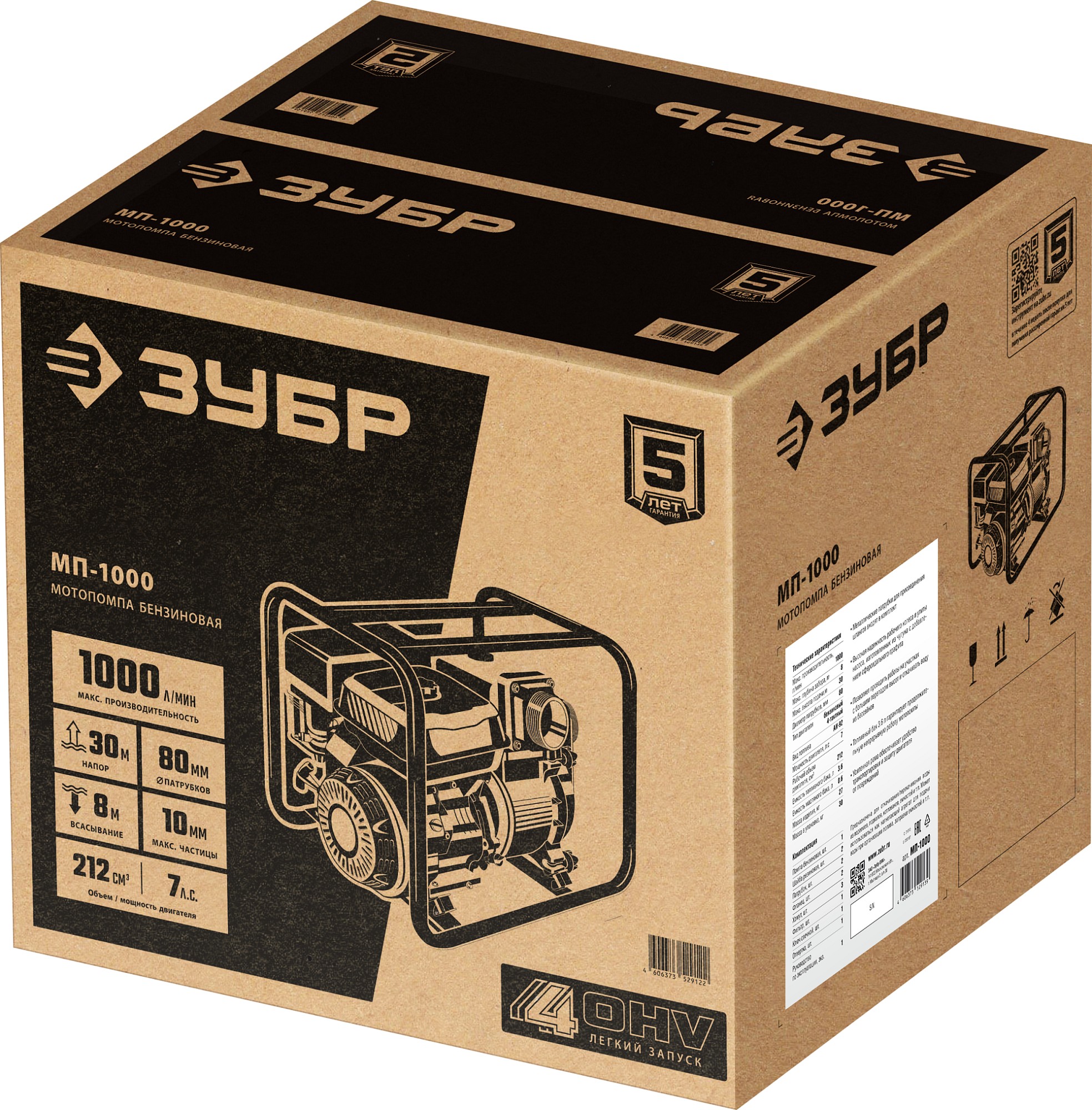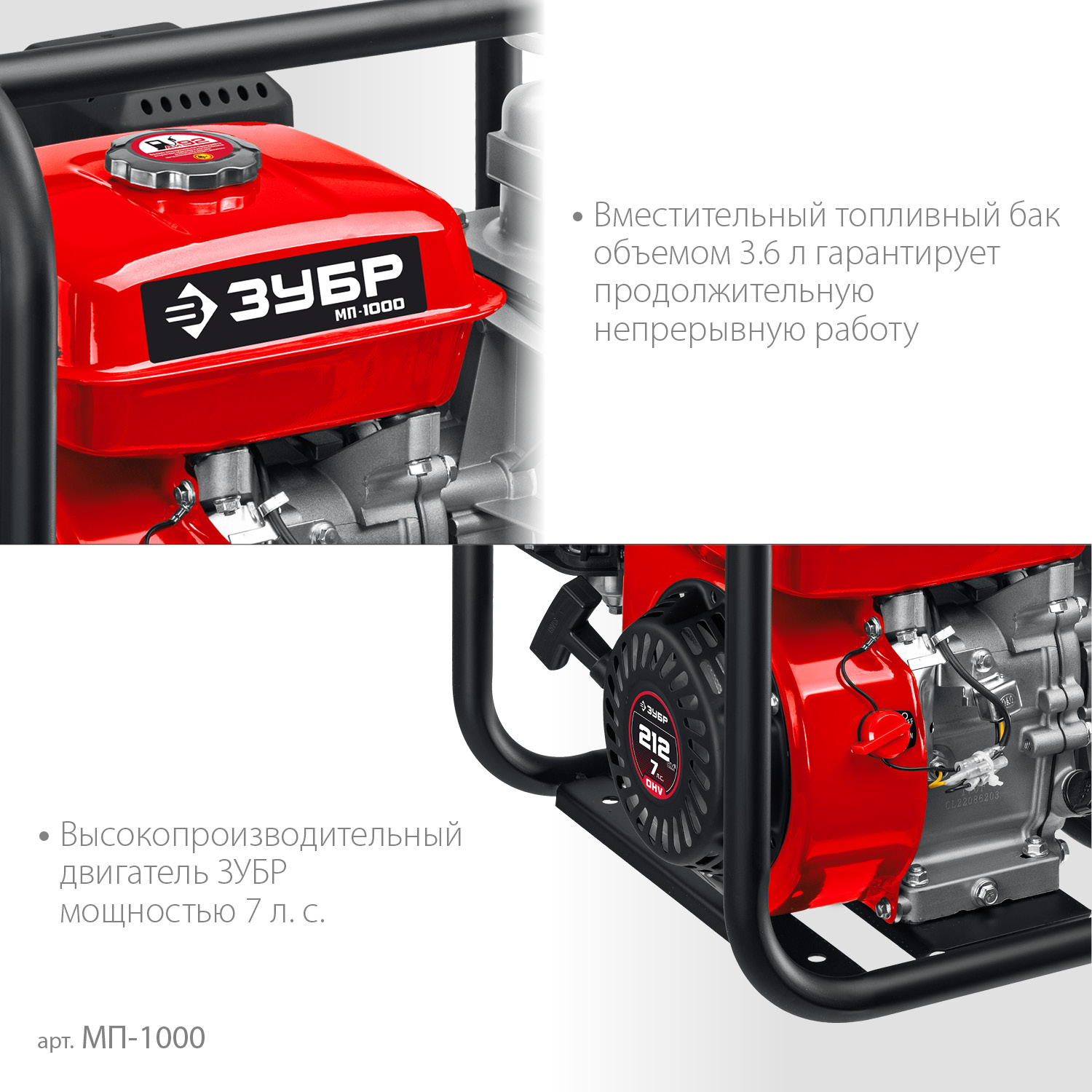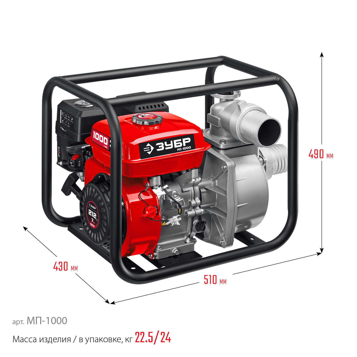 ПроизводителиМотопомпа бензиновая МП-1000 (5.15 кВт, произв. 1000 л/мин, патрубки 80 мм, кор.) ЗУБР