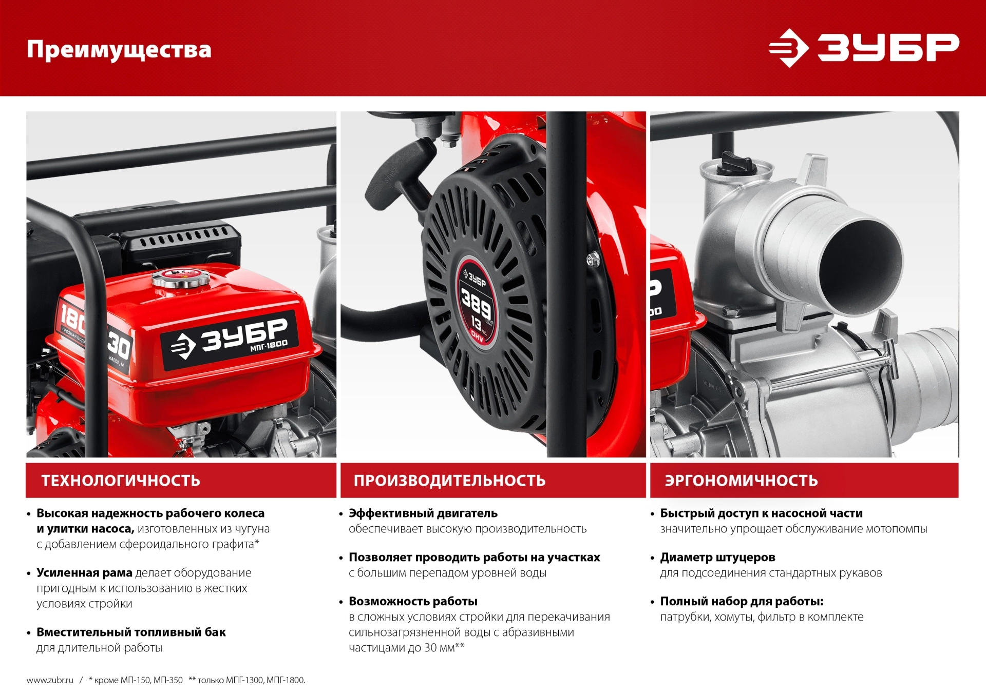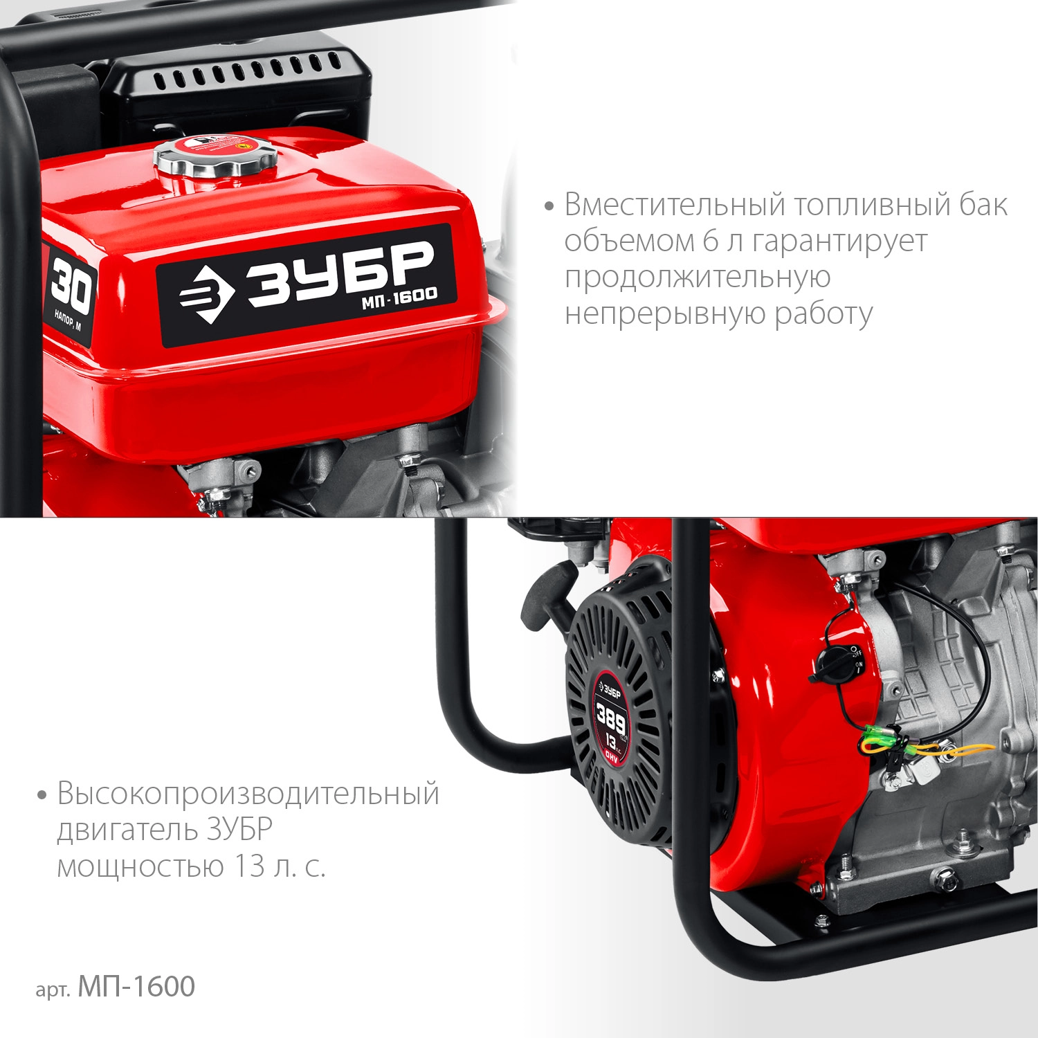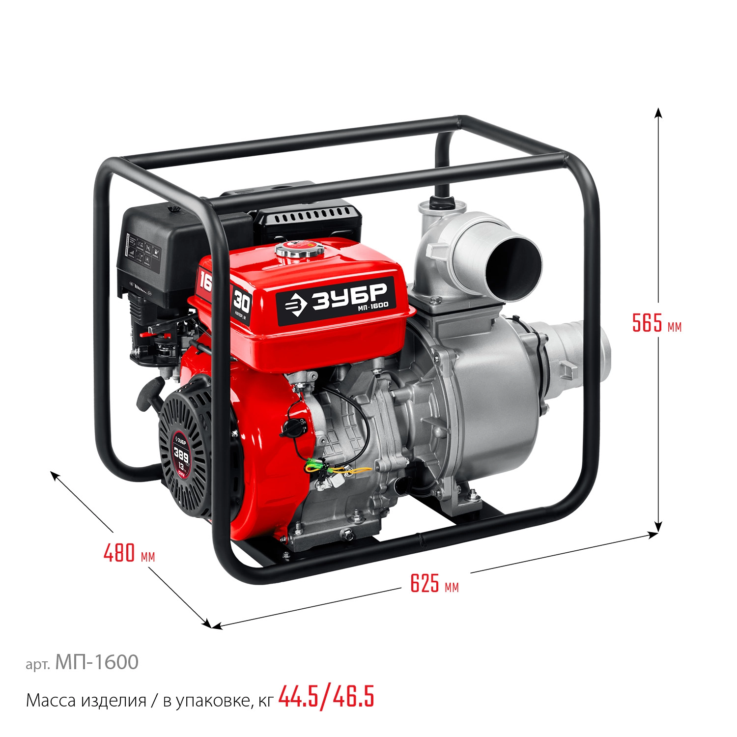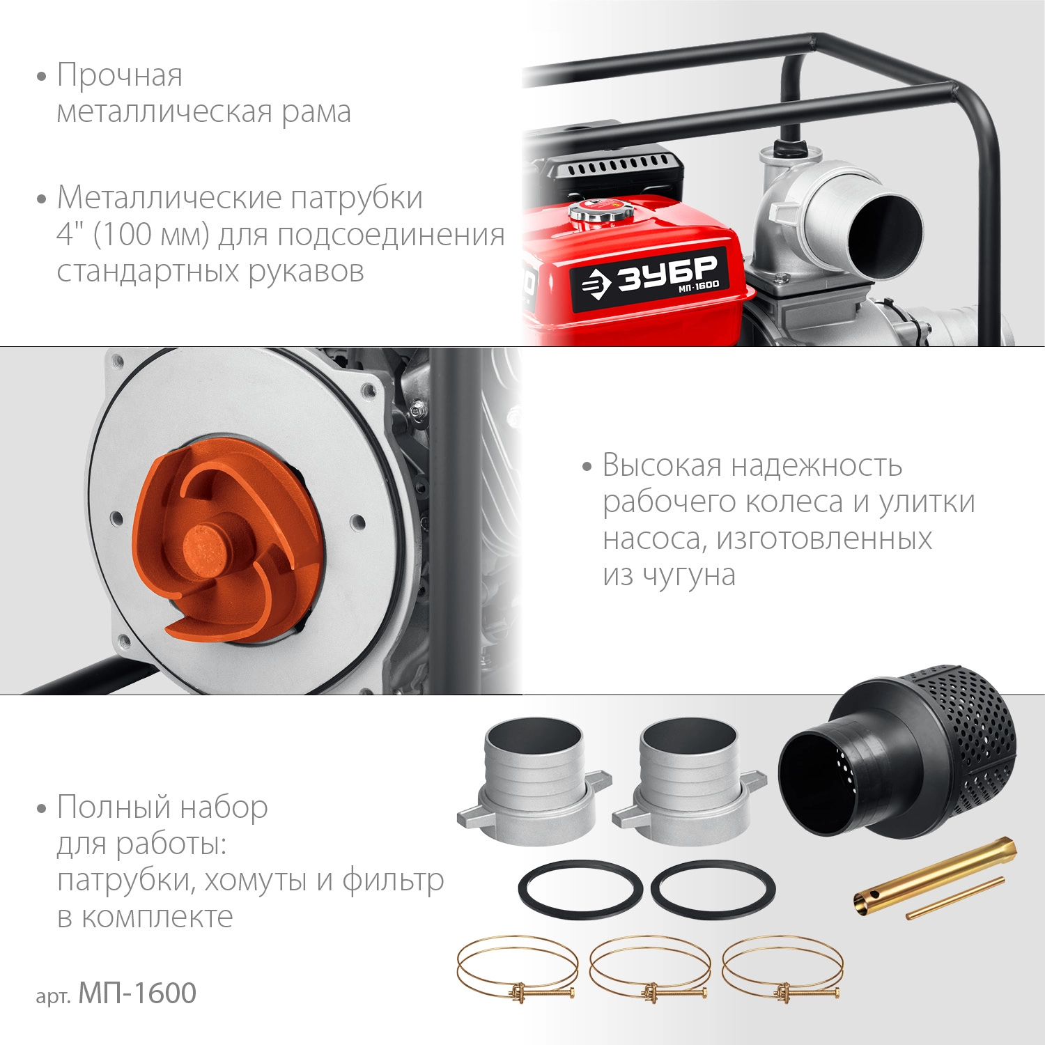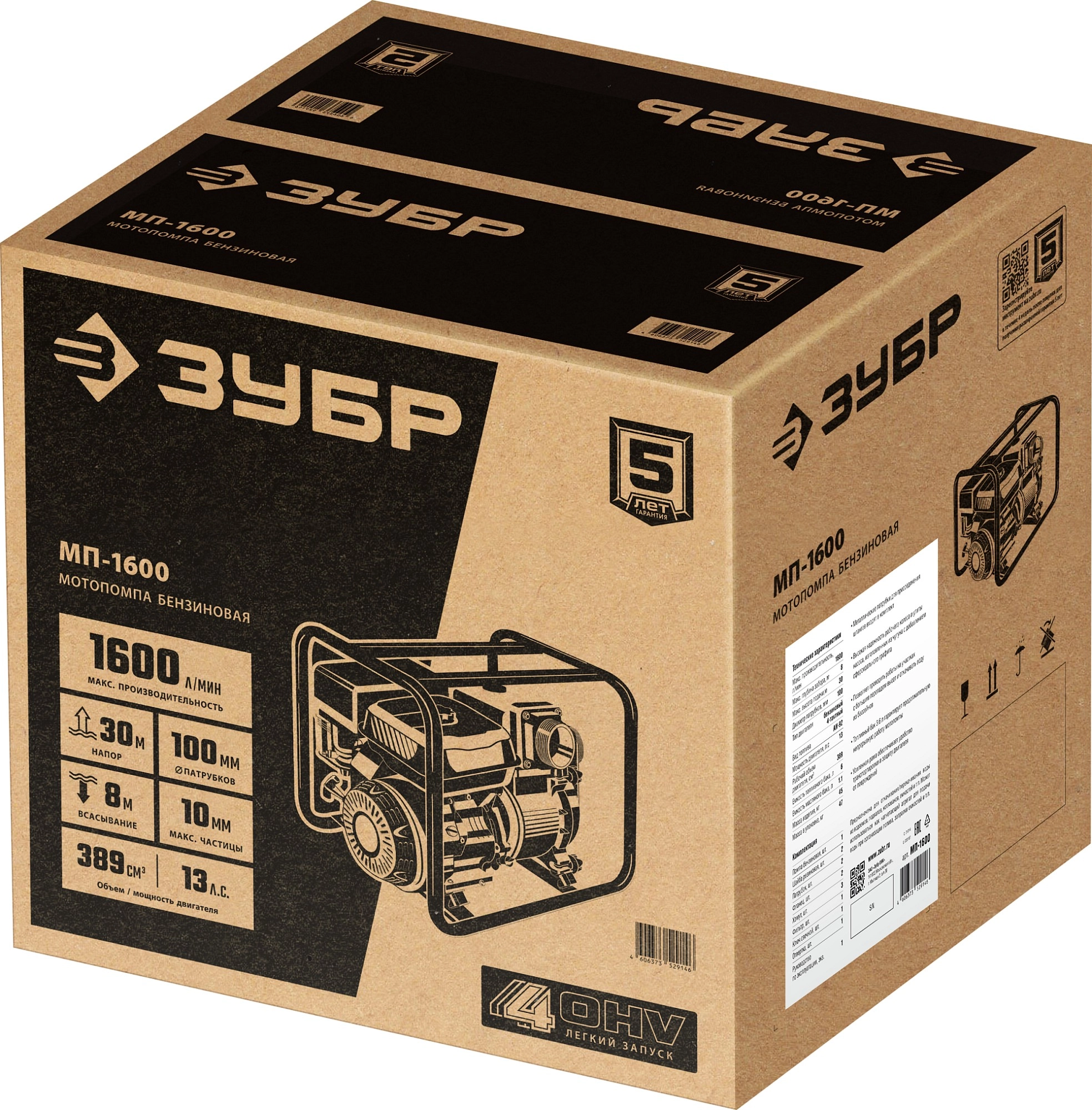 ПроизводителиМотопомпа бензиновая МП-1600 (9.6 кВт, произв. 1600 л/мин, патрубки 100 мм, кор.) ЗУБР