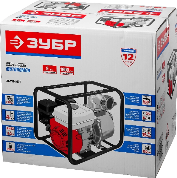 ХарактеристикиАртикул МП-1600Бренды ЗубрСтрана производства КитайОбъём двигателя 270Тип двигателя бензиновыйВес 44.22Максимальный напор 28Мощность двигателя 9Максимальная производительность 1600Запуск ручнойОбщая высота подачи 28Объем топливного бака 6Максимальный размер частиц 15Диаметр патрубков 100/100 ммМаксимальная высота всасывания 8Длина 560Ширина 490Цикл двигателя 4-х тактныйВысота 620Диаметр выходного отверстия 100Объем масляного бака 1.1Применение для грязной водыОписание товара обновлено 08.12.2025 15:32:44Мотопомпа бензиновая ЗУБР МП-1600, предназначена для откачки (перекачки) воды из водоемов, подвалов, котлованов, емкостей и т.п. Быстро и уверенно справится с масштабными работами по перекачке чистой или слабозагрязненной воды. Применяется в строительных вспомогательных работах, отлично подойдет для небольших сельских хозяйств. Экологичный, экономичный 4-х тактный двигатель ЗУБР гарантирует безотказность работы. Металлические патрубки для присоединения шлангов входят в комплект.Высокая надежность рабочего колеса и улиты насоса, изготовленных из чугуна с добавлением сфероидального графита. Позволяет проводить работы на участках с большим перепадом высот и откачивать воду из бассейнов. Усиленная рама делает оборудование пригодным к использованию в жестких условиях стройки.Производитель: Крафтул И/Е Гмбх, Альтер Поствег Штр., Лоенинген, Германия