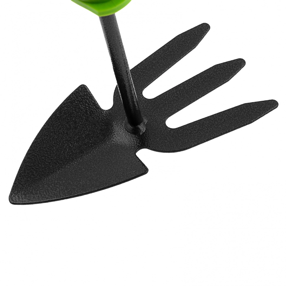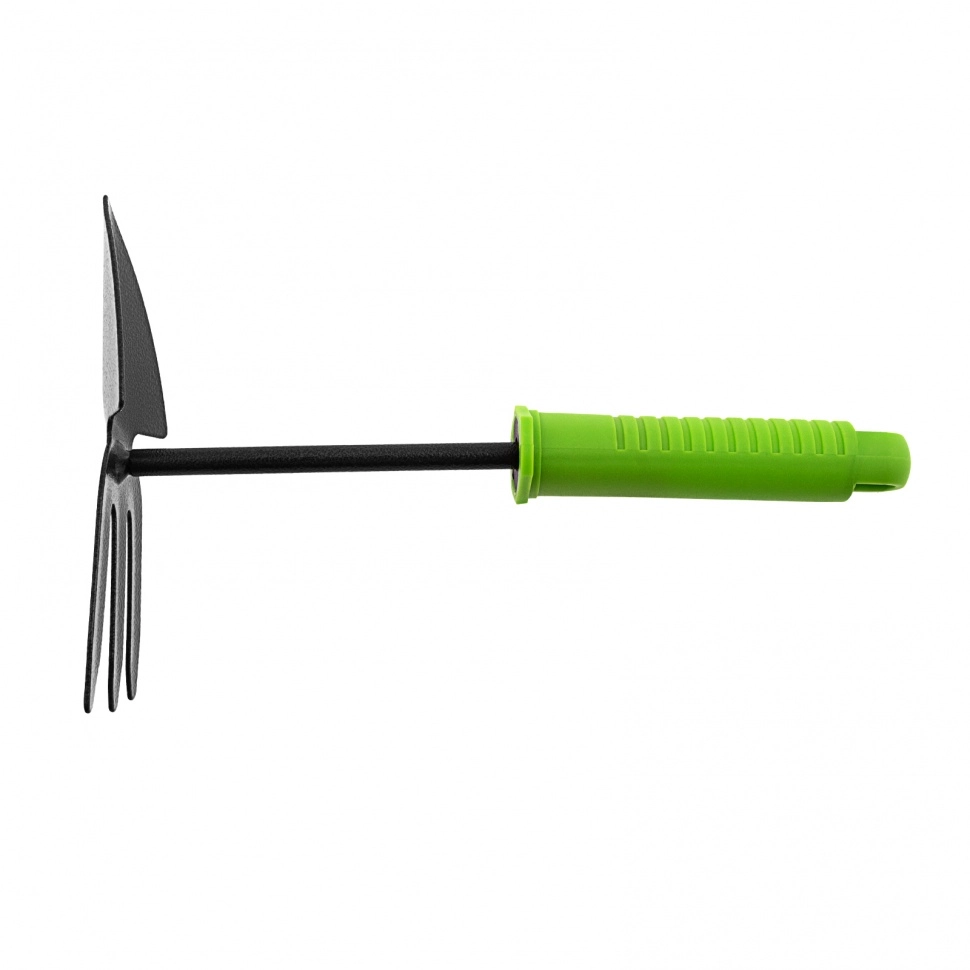 Среднеуглеродистая сталь обеспечивает необходимые прочностные характеристики рыхлителя. Молотковая эмаль гарантирует коррозионную стойкость металлической части. Рифленая рукоятка повышает удобство работы, т. к. не проскальзывает в руке. Рукоятка имеет отверстие, благодаря которому рыхлитель можно подвешивать для компактного хранения. Легкая мотыжка весом 160 г практически не оказывает нагрузки на руку, поэтому не вызывает усталости. Характеристики: