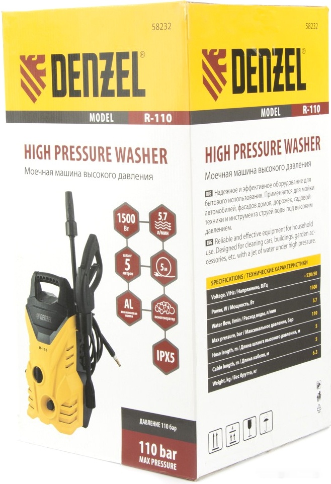 ПроизводителиМойка высокого давления R-110, 1500 Вт, 110 бар, 5,7 л/мин, переносная Denzel