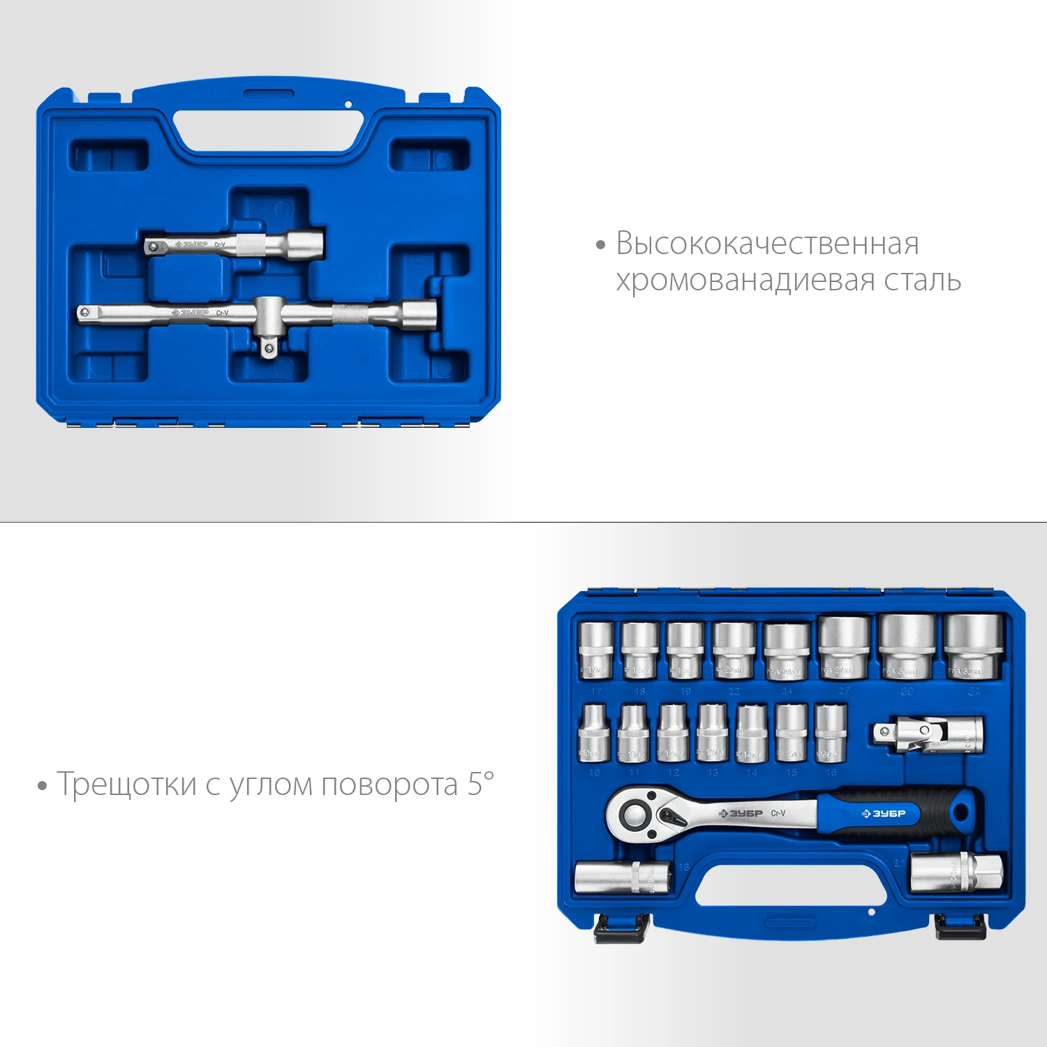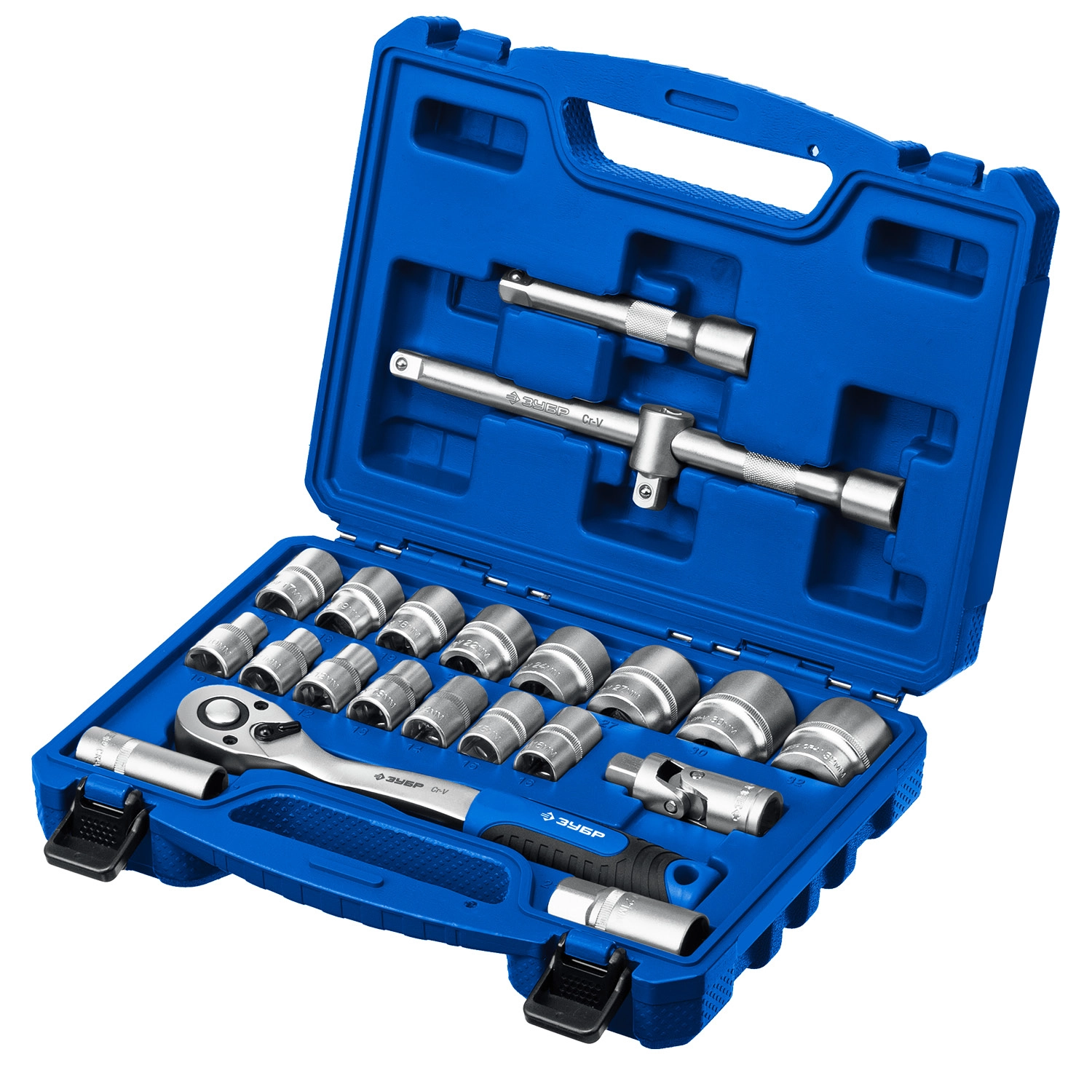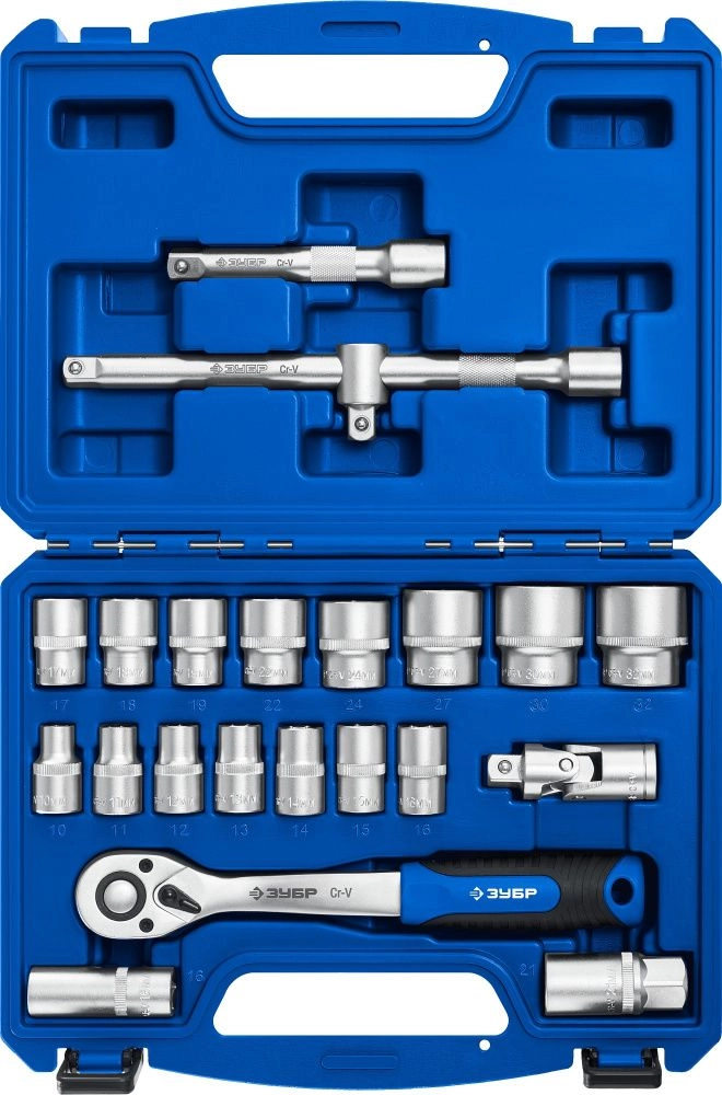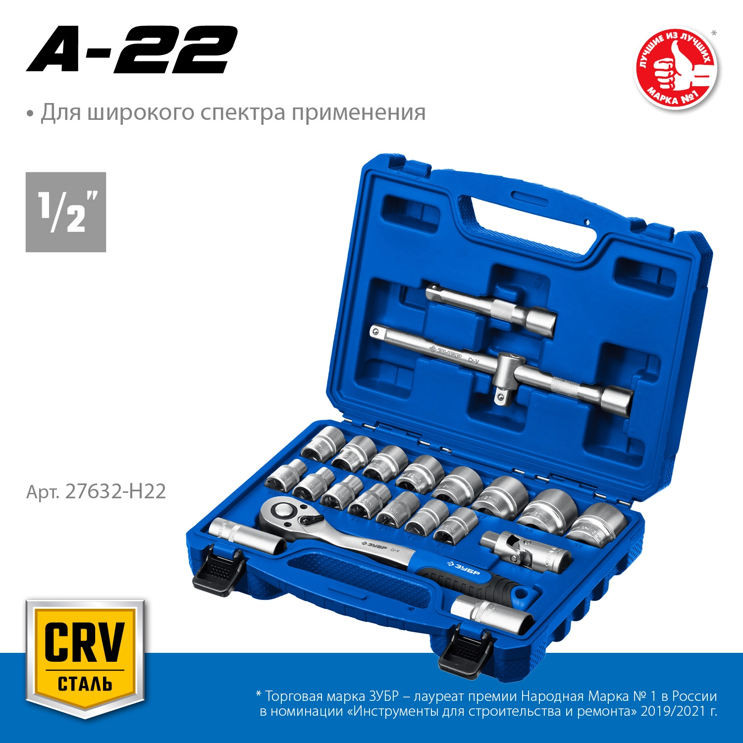 ПроизводителиНабор головок с трещоткой и удлинителями 1/2" 10-32мм, 22пр. (27632-H22_z01) ЗУБР