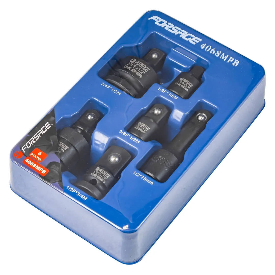 ПроизводителиНабор адаптеров ударных 6пр., (адаптеры 4шт., удлинитель 125мм, кардан 1/2'')(F-4068MPB) Forsage