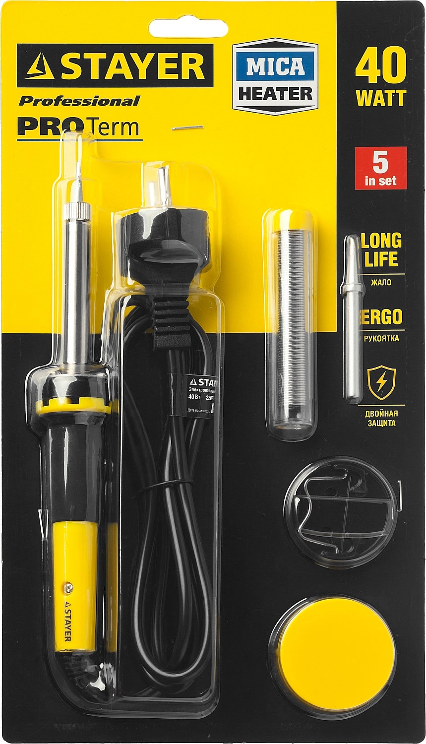 ПроизводителиНабор для паяльных работ STAYER "PROFI" PROTerm, 55312-40-H5, паяльник 55300 + подставка + припой +
