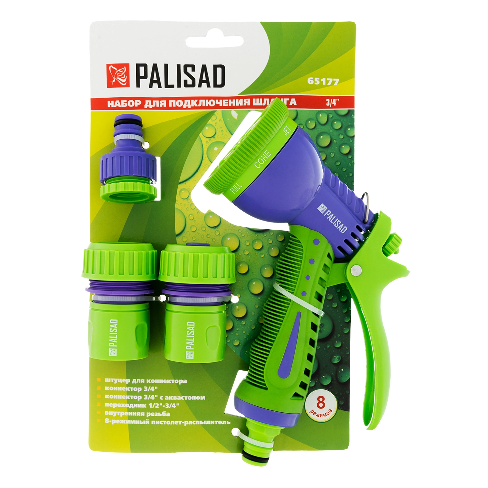 ПроизводителиНабор для подключения шланга 3/4" (пистолет 8 режимов, адаптер, 2 соединителя) (65177) PALISAD