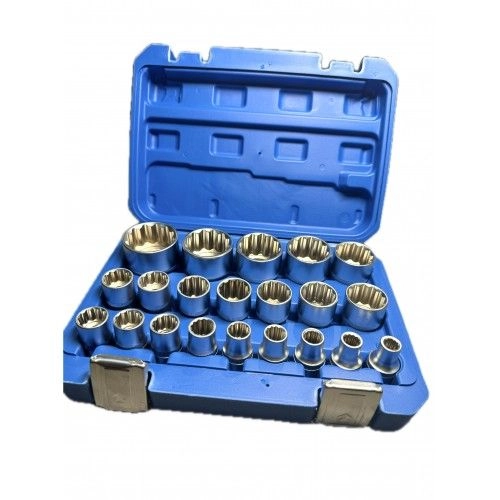 Набор специальных 12-гранных головок. Головки позволяют откручивать несколько типов шурупов: шестигранные, двенадцатигранные, шурупы с профилем Torx-E и дюймовые шурупы. Розетки изготовлены из прочной стали CrV 50BV30.