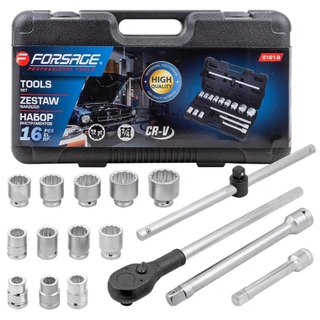 ПроизводителиНабор головок 16пр. 3/4" (12гр.)(17, 19,21,24,27,30,32,33,36,38,41,46,50мм)(F-6161-9) Forsage