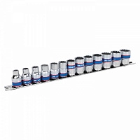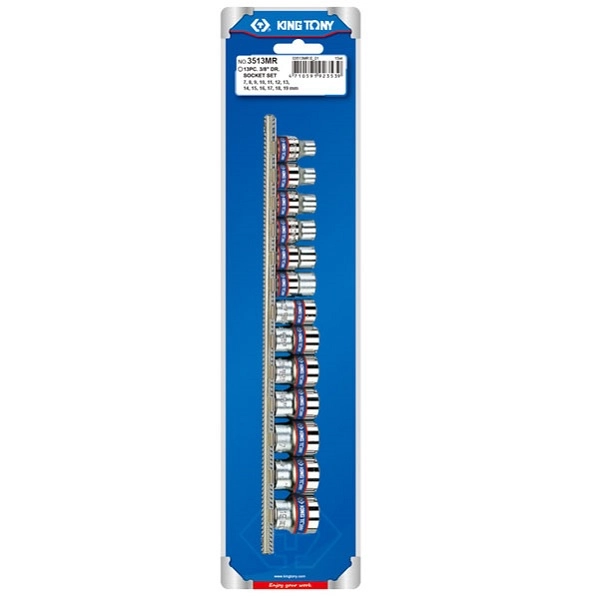 Набор слесарного ручного инструмента профессионального качества King Tony 3013MR с присоединительным квадратом 3/8 дюйма составлен из 13-ти двенадцатигранных торцевых головок с рабочими размерами от 7 до 19 миллиметров, размещённых на металлическом держателе.