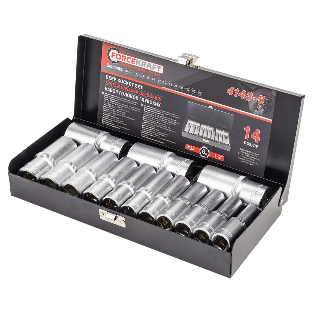 ПроизводителиНабор головок глубоких 1/2", 10-32 мм, 6 гр., 14 пр. (FK-4143-5) FORCEKRAFT