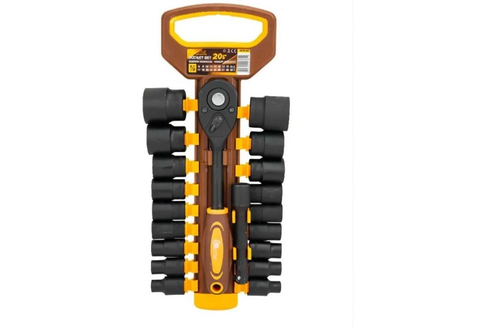 Набор головок 20пр. 1/2" - это профессиональный комплект из 20 предметов с присоединительным квадратом 1/2", включающий 18 шестигранных головок размером 8, 9, 10, 11, 12, 13, 14, 15, 16, 17, 18, 19, 21, 22, 24, 27, 30, 32 мм, реверсивную трещотку длиной 250 мм и удлинитель на 125 мм. Инструменты изготовлены из высокопрочной инструментальной стали, обеспечивающей износостойкость и надёжность при работе с высоким крутящим моментом. Набор предназначен для профессионального использования в автосервисе, при ремонте техники и монтаже оборудования, а все компоненты удобно организованы в прочном кейсе для хранения и транспортировки.Производитель: