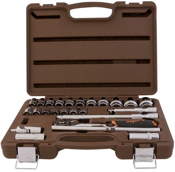 ПроизводителиНабор головок с трещоткой и удлинителями 1/2", 8-32мм, 6гр., 25 пр., пласт.кейс (911225) Ombra