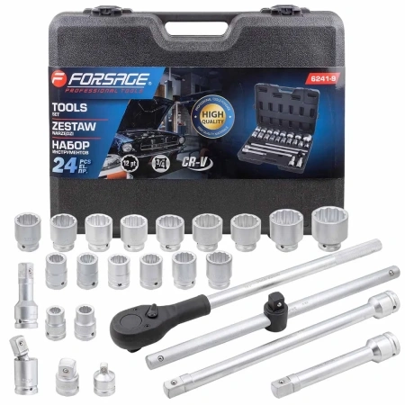 ПроизводителиНабор головок с трещоткой и удлинителями (3/4") 17-50мм, 24пр. (F-6241-9) Forsage