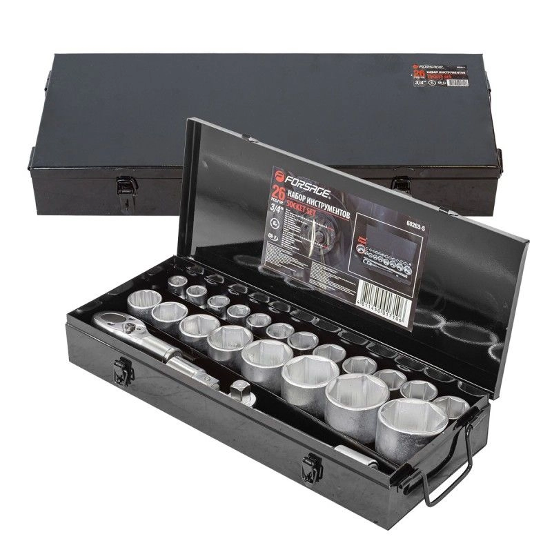 ПроизводителиНабор головок с трещоткой и удлинителями (3/4") 17-50мм, 26пр., мет.кейс (F-68263-5) Forsage