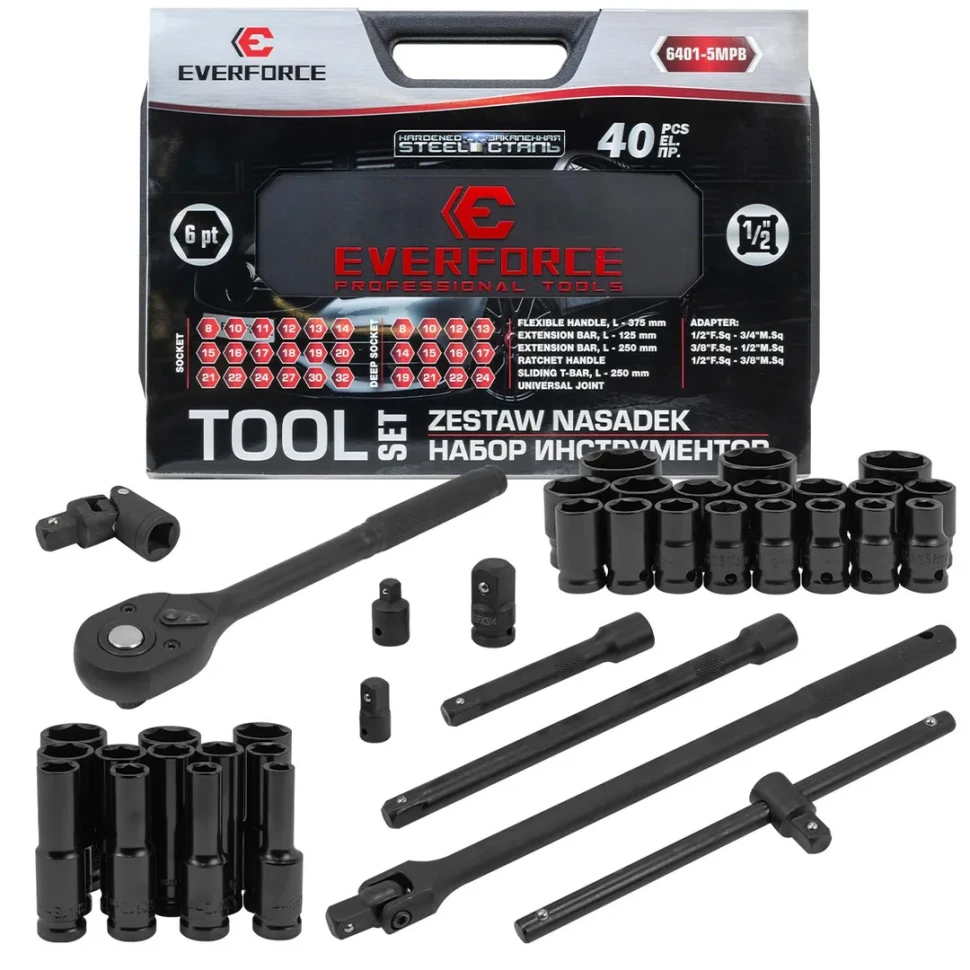 ПроизводителиНабор головок ударн. 40пр. 1/2" (6гр.)(8-32мм)(EF-6401-5MPB) EVERFORCE