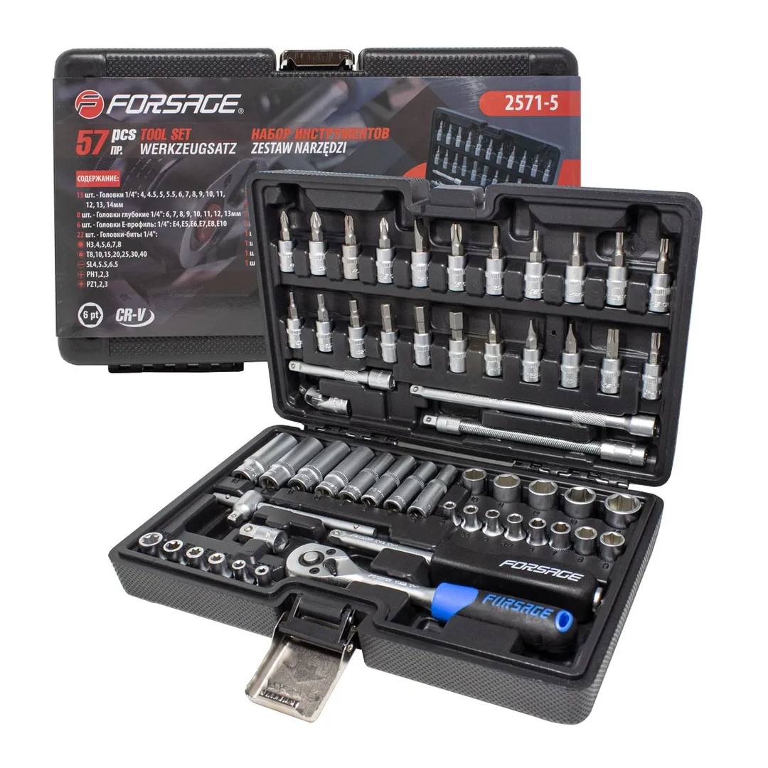 Набор инструмента 57пр. 1/4" (6-гран.) (4-14мм) (E4-E10) Forsage F-2571-5 - это набор, который содержит 57 различных инструментов, предназначенных для работы с разнообразными крепежными элементами и механизмами. Он включает в себя головки, ключи, отвертки и другие аксессуары, необходимые для эффективного выполнения различных задач.