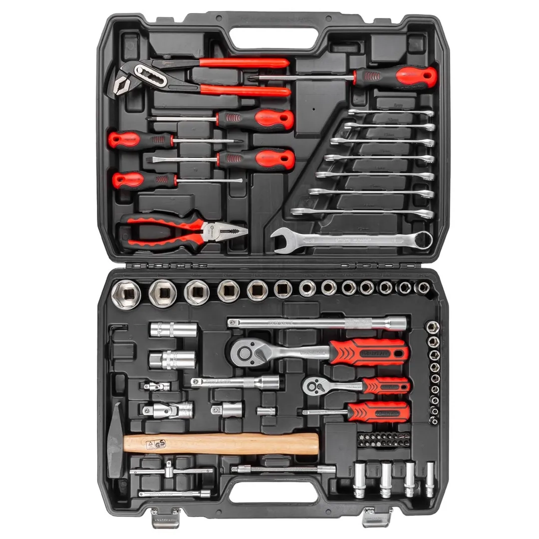 ХарактеристикиАртикул FK-4772-5БрендыСтрана производства КитайНабор инструментов из 77 предметов имеет уникальную комплектацию и пригодится на СТО, в быту или в гараже. Благодаря этому набору можно легко и быстро выполнить любые работы, связанные с ремонтом автомобиля или другой техникой. Все составляющие комплекта упакованы в пластиковый кейс, где у каждого предмета своя ячейка хранения. Инструменты изготовлены из хромованадиевой стали (CR-V), обеспечивающей надежность и долговечность при использовании. Посадочный квадрат: 1/2", 1/4". Тип головок: 6-гранные, короткие, глубокие.Производитель: Форскрафт Лтд., Тайвань