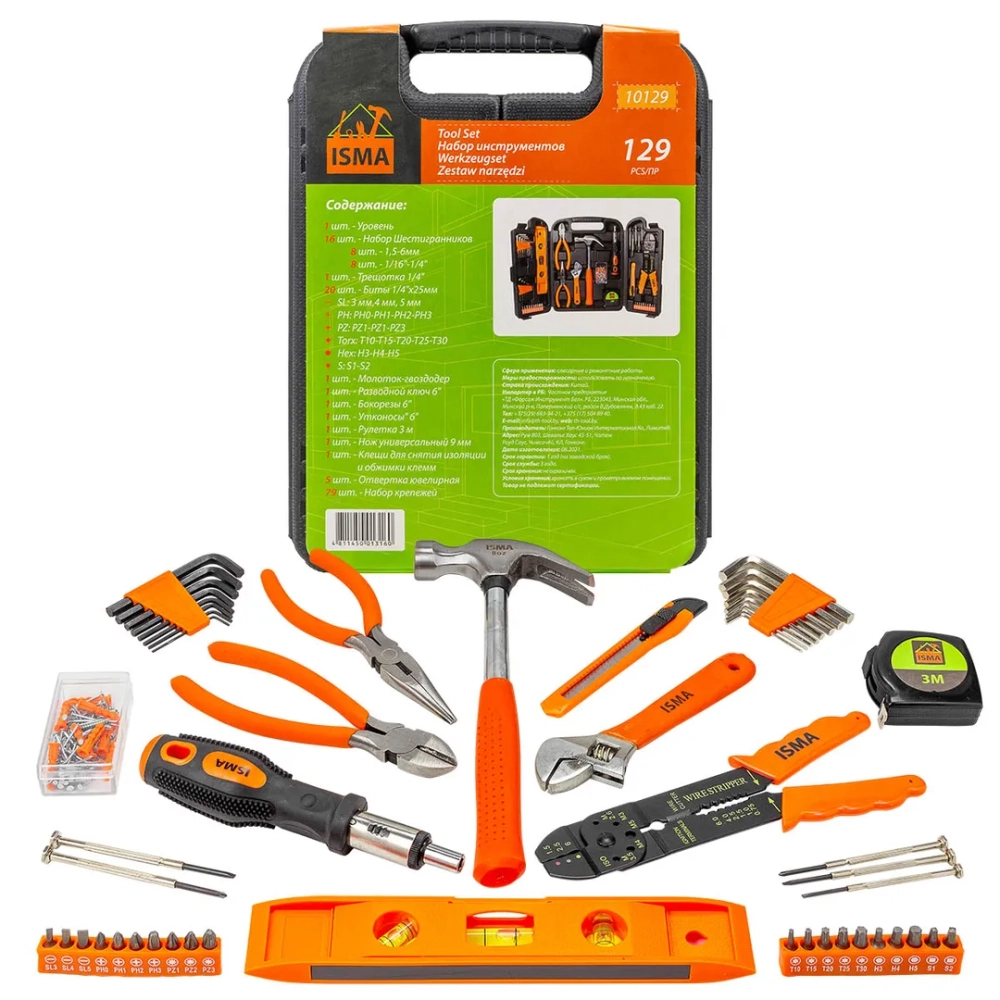Набор инструментов 129пр. (шарнирно-губцевый,биты,отвертки,молоток, нож канцелярский), в кейсе ISMA ISMA-10129 - это универсальный комплект, который включает в себя все необходимые инструменты, необходимые для выполнения различных задач в строительстве, ремонте и домашнем хозяйстве.