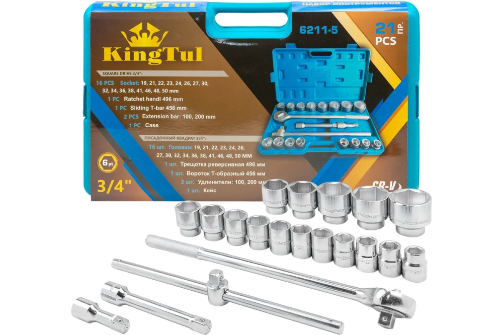 ПроизводителиНабор инструментов 21пр. 3/4" (6гр.)(19-50мм) в пласт.кей(KT-6211-5) KINGTUL
