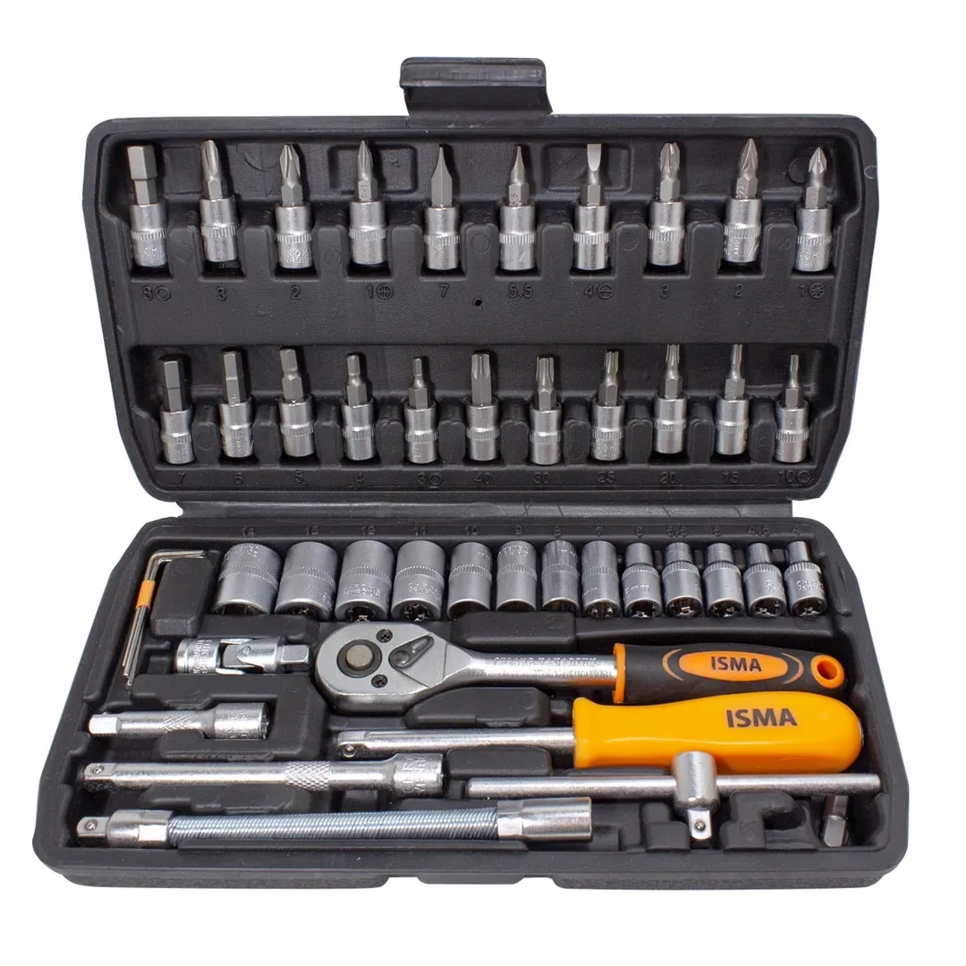 Универсальный набор инструментов ISMA из 46 предметов для слесарных и монтажных работ в кейсе.